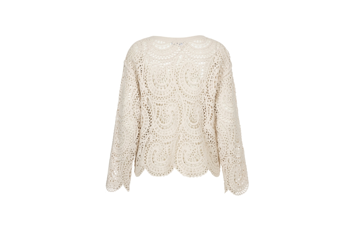 Frank Walder trui NOS716070 919. Dit rechtvallende model heeft een ronde halslijn en lange mouwen. Deze beige trui van Frank Walder is uitgevoerd in een opengehaakte kwaliteit en sluit aan de voorzijde door middel van zilverkleurige knopen. Het model is gedetailleerd met twee decoratieve klepzakken.