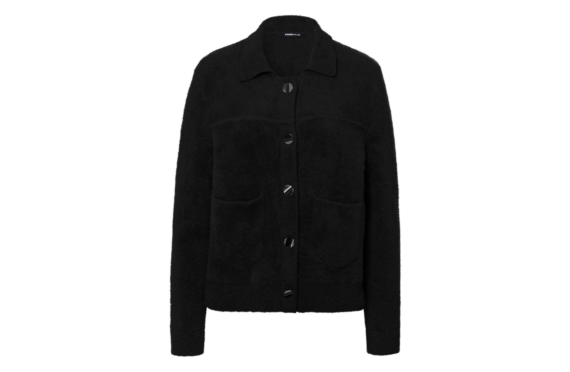 Frank Walder NOSStrick 999 Black. Dit rechtvallende model is voorzien van een kraag en heeft lange mouwen. Dit zwarte jasje van Frank Walder sluit door middel van knopen en beschikt over twee opgestikte zakken.