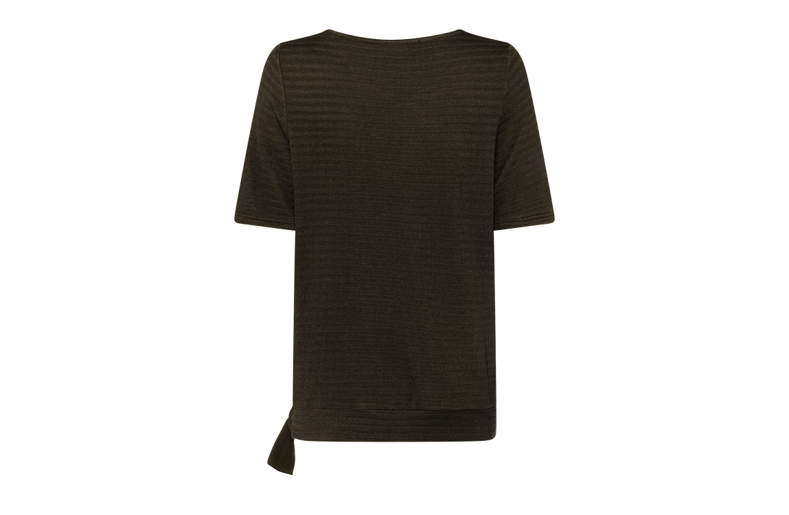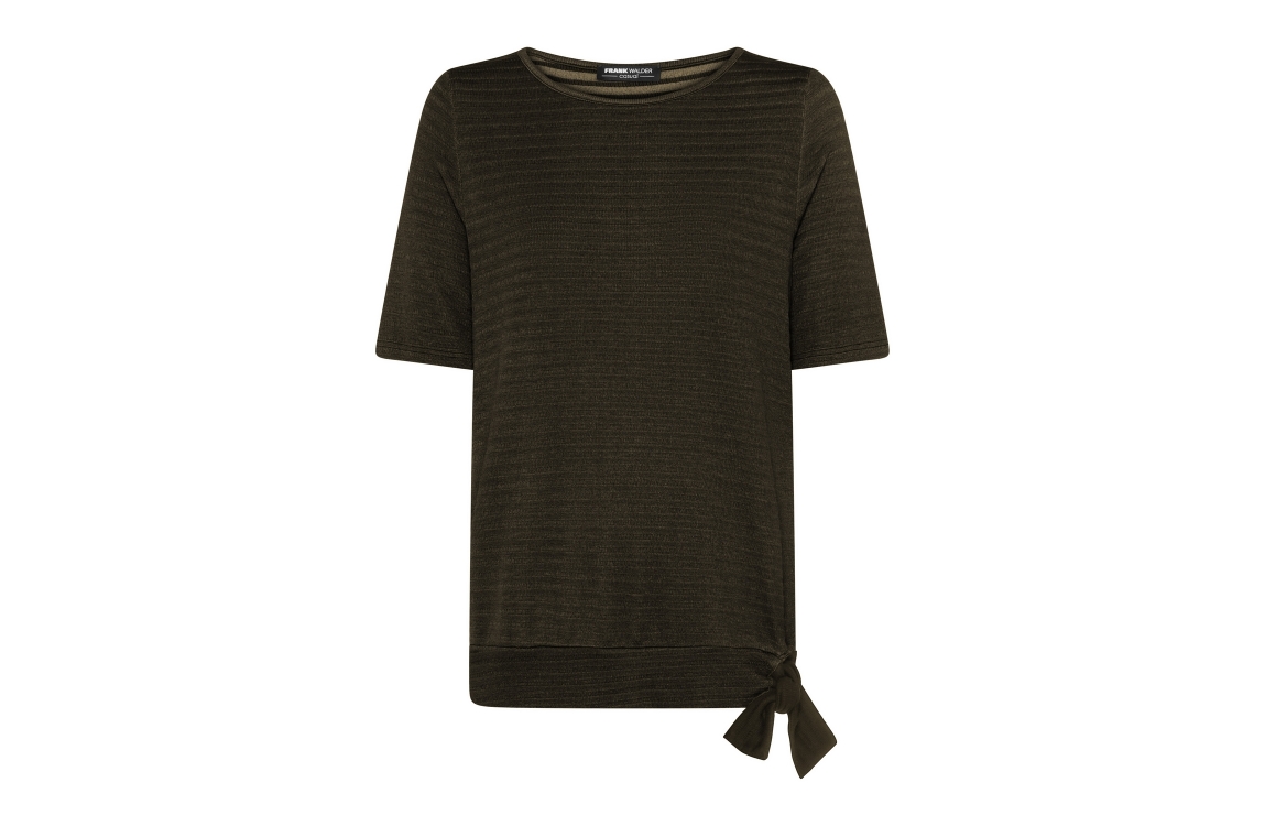 Frank Walder top NOS716416 768. Dit rechtvallende model heeft een ronde halslijn en korte mouwen. Deze donkergroene top van Frank Walder is uitgevoerd met een streepstructuur en is afgewerkt met een elastische zoom met strikdetail.