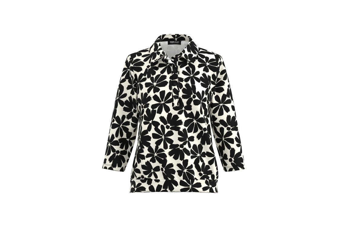 Frank Walder top NOS725407. Dit rechtvallend model heeft een kraag en driekwart mouwen. Deze zwarte top van Frank Walder is all-over bewerkt met een bloemen print en sluit aan de voorzijde door middel van knopen. Dit model is uitgevoerd in een stretch-kwaliteit.