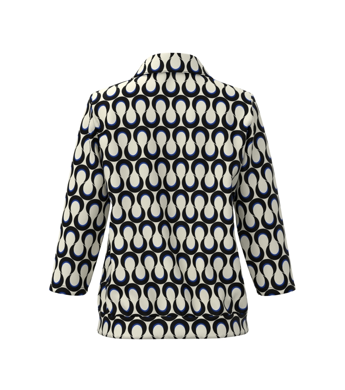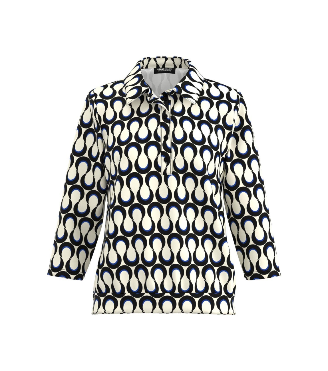 Frank Walder NOSTop/TShirt 552/055 Blue print. Dit rechtvallend model heeft een kraag en driekwart mouwen. Deze off-white top van Frank Walder is all-over bewerkt met een print en sluit aan de voorzijde door middel van knopen. Dit model is uitgevoerd in een stretch-kwaliteit.