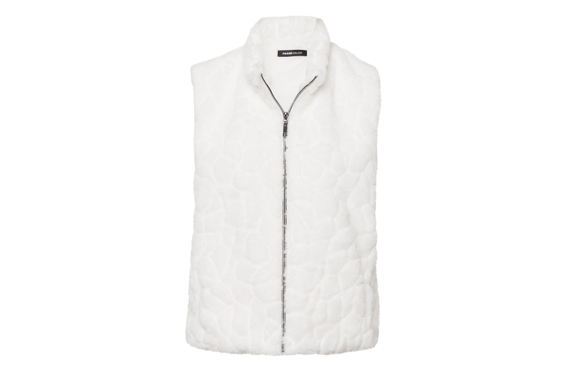 Frank Walder bodywarmer NOS725860. Dit rechtvallend model is voorzien van een ronde kraag en is mouwloos. Deze witte bodywarmer van Frank Walder sluit door middel van een rits en beschikt over twee steekzakken. Dit model is uitgevoerd in een faux fur kwaliteit.
