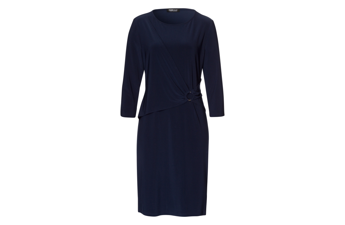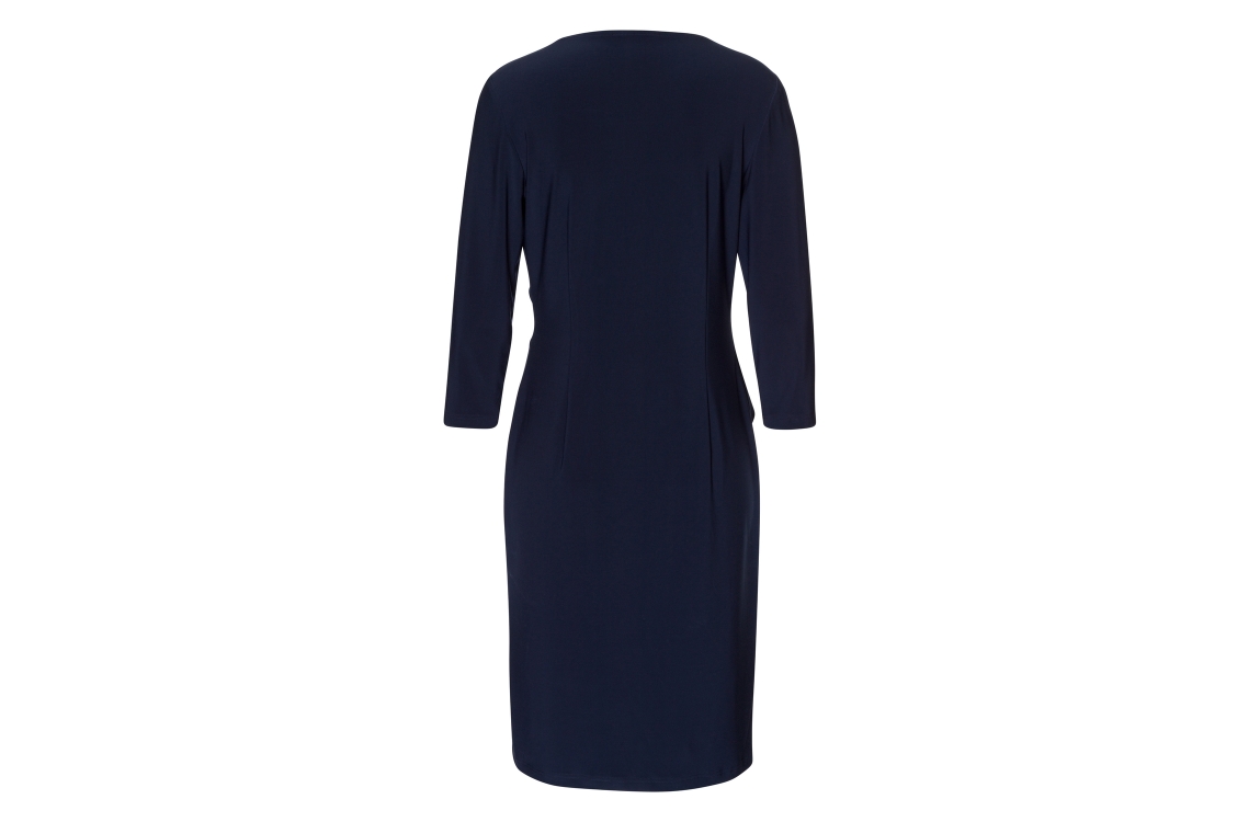 Frank Walder jurk S41601502. Dit rechtvallend model is voorzien van een ronde hals en heeft driekwart mouwen. Deze blauwe jurk van Frank Walder is aan de voorzijde bewerkt met een gespdetail.