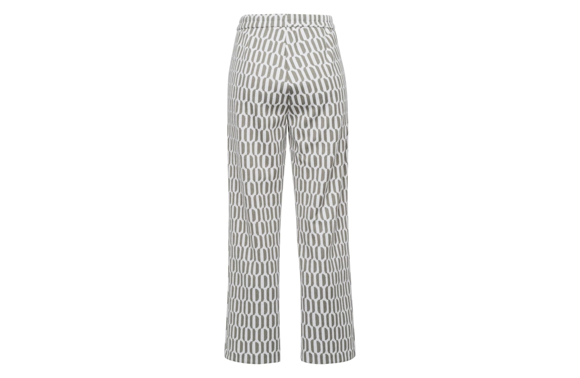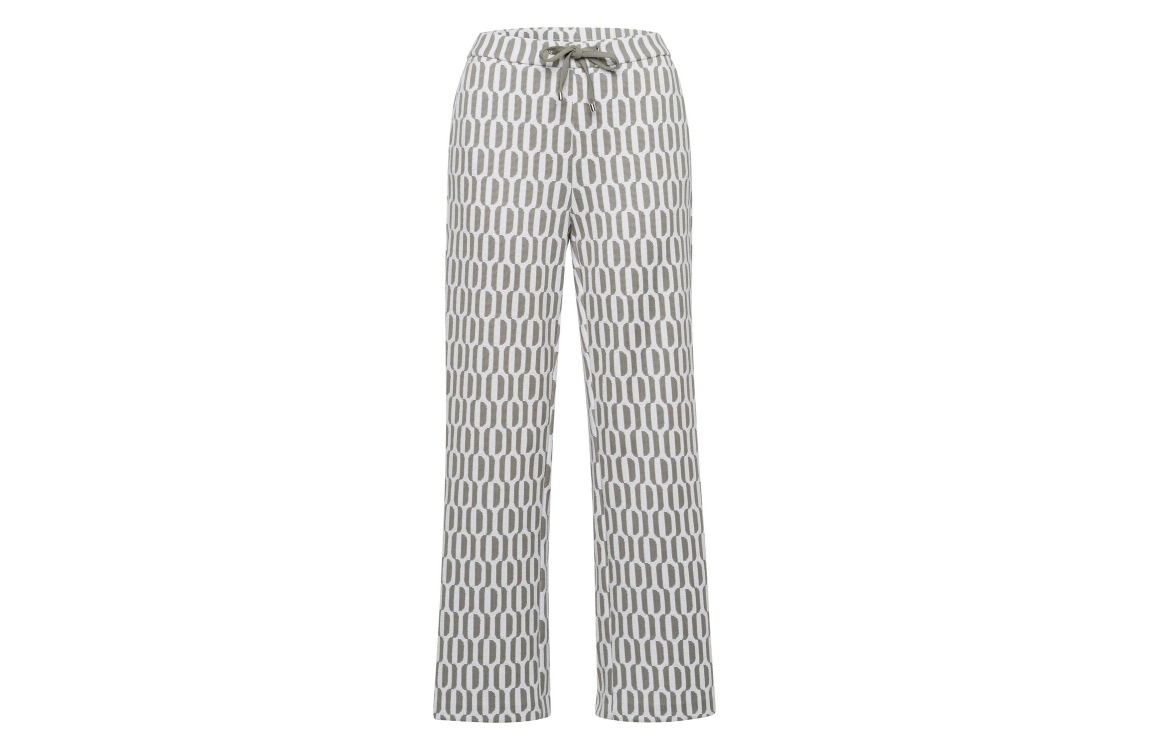 Frank Walder broek S52203602. Dit soepelvallend model sluit door middel van een elastische boord met trekkoorden. Deze groene broek van Frank Walder is bewerkt met een print.