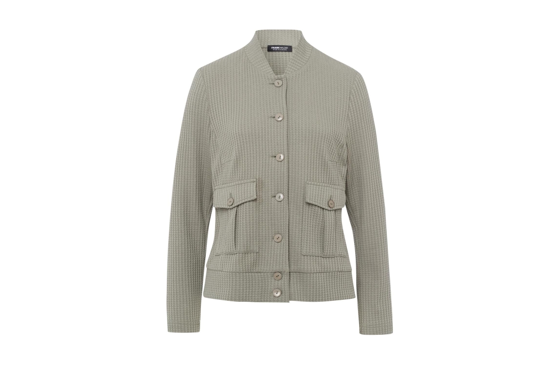 Frank walder jasje S52203001. Dit rechtvallend model is voorzien van een ronde hals en heeft lange mouwen. Dit groene jasje sluit door middel van knopen en beschikt over twee klepzakken.