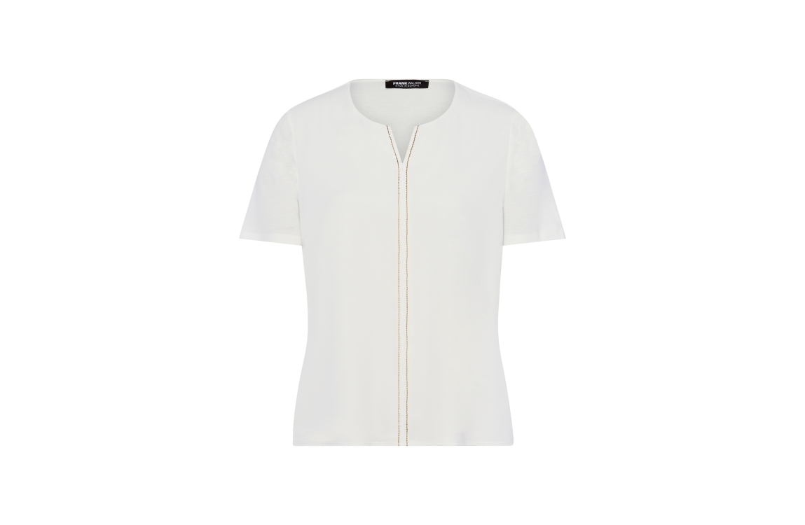 Frank Walder blouse S61202420 902. Dit rechtvallende model heeft een ronde halslijn met V-inkeping en korte mouwen. Deze witte blouse van Frank Walder is op het voorpand gedetailleerd met goudkleurige draden en is voorzien van een ondershirt.