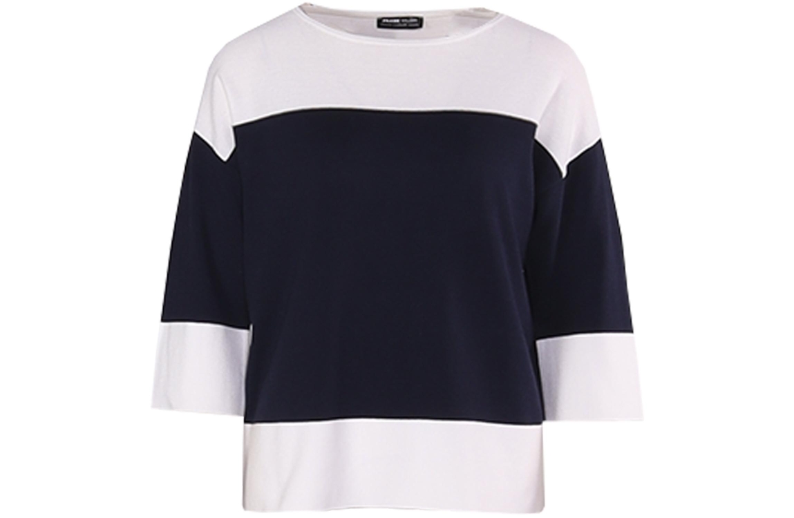 Frank Walder top S61502060. Dit soepelvallend model heeft een ronde hals en driekwart mouwen. Deze wit/blauwe top van Frank Walder is uitgevoerd met verschillende kleurvlakken en beschikt over elastische onderzijdes.