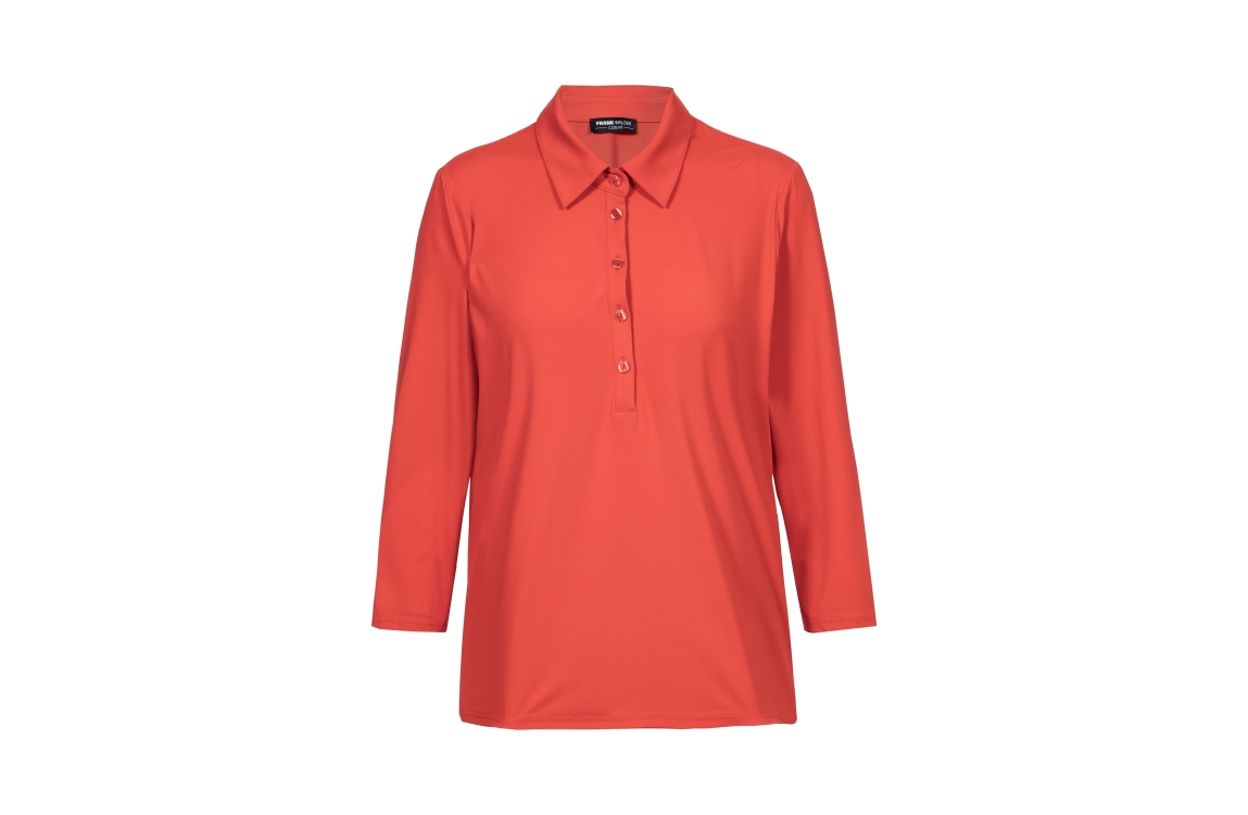 Frank Walder top S61502406 346. Dit rechtvallende model heeft een kraag met knoopsluitingen en driekwart mouwen. Deze roodkleurige top van Frank Walder is uitgevoerd in stretchkwaliteit.