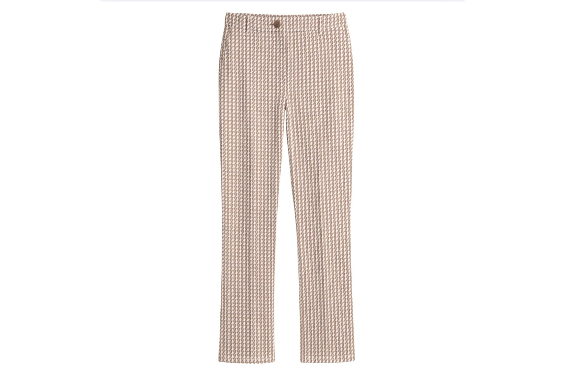 Frank Walder broek S62602605. Dit rechtvallend model sluit door middel van een knoop en een rits. Deze witte broek van Frank Walder is bewerkt met een beige grafische print en voorzien van schuine steekzakken.