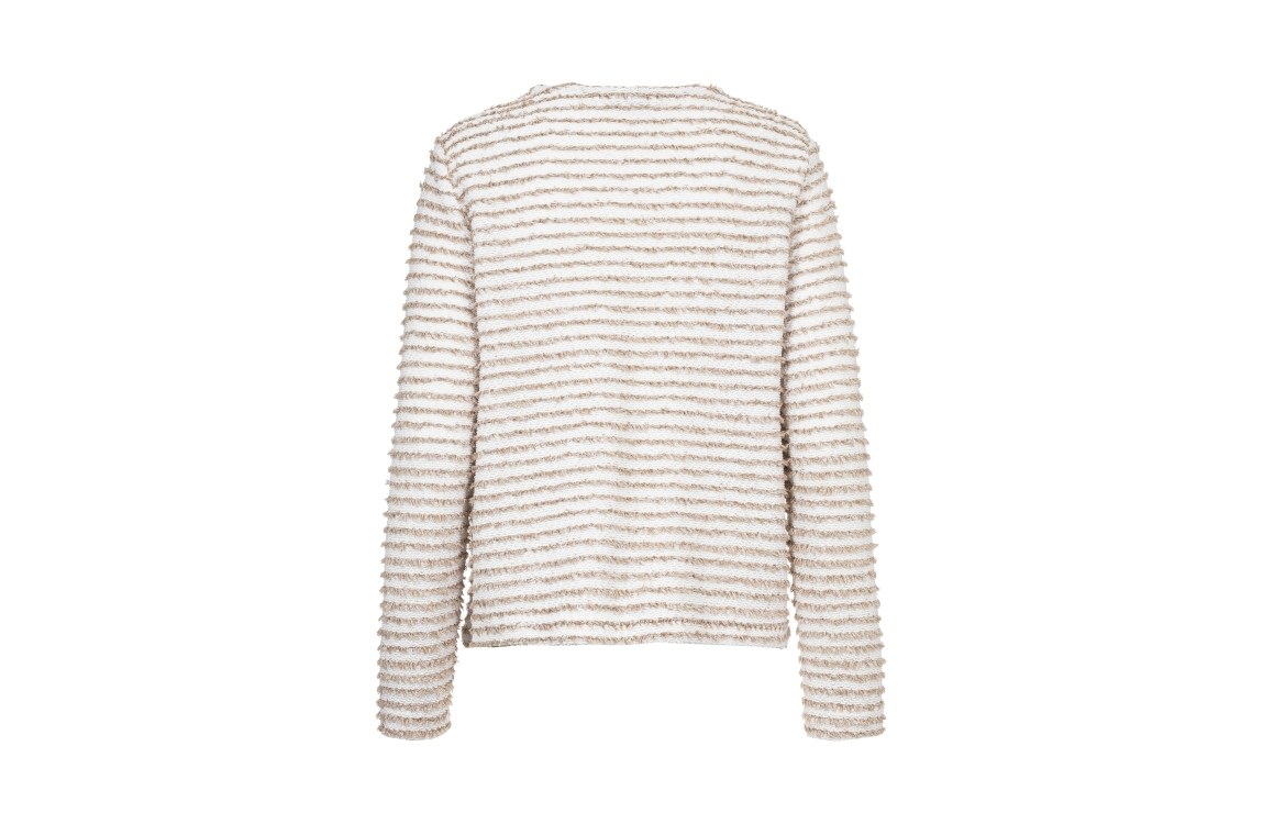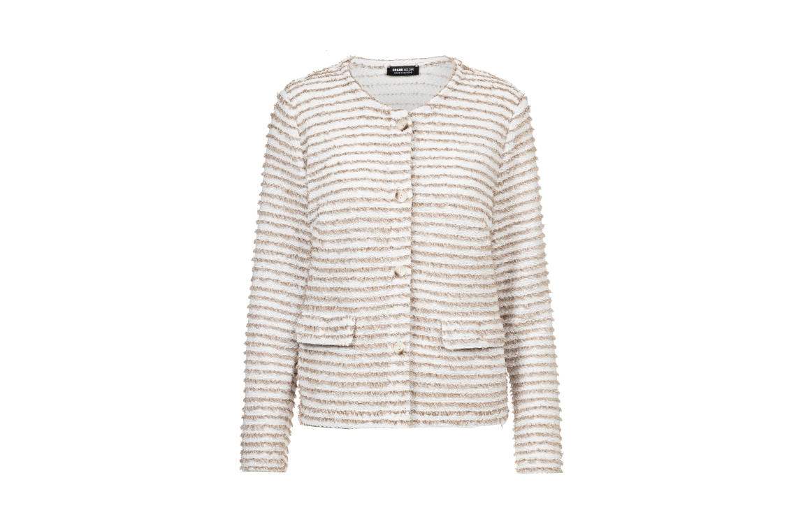 Frank Walder jasje S62104301. Dit rechtvallende model heeft een ronde halslijn en lange mouwen. Het beigekleurige jasje van Frank Walder sluit door middel van knopen en is uitgevoerd met een gestreepte bouclé-structuur. Het model is afgewerkt met twee decoratieve klepzakken.