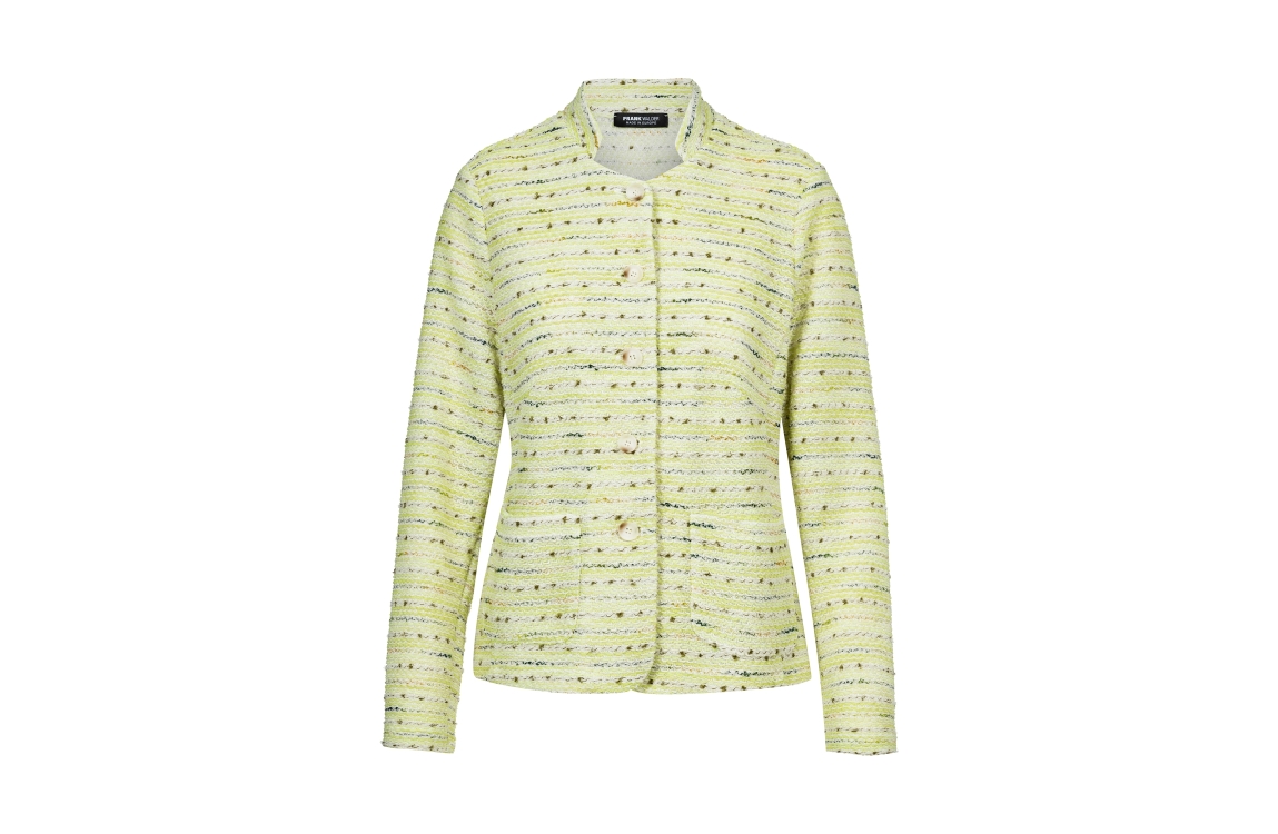 Frank Walder jasje S62203002 030070. Dit licht getailleerde model heeft een opstaande kraag en lange mouwen. Het lichtgroene jasje van Frank Walder sluit aan de voorzijde door middel van knopen en is uitgevoerd met een streepprint in verschillende kleuren. Het model is voorzien van twee opgestikte zakken.