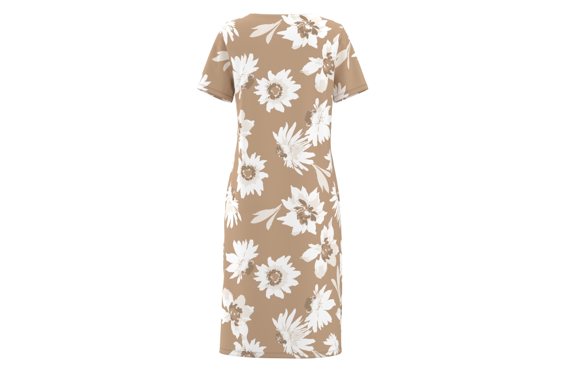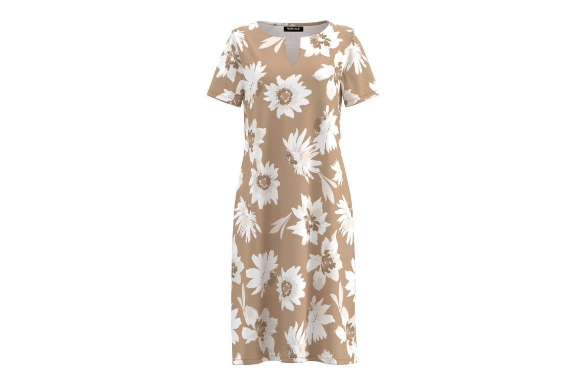 Frank Walder jurk S62104501. Dit aangesloten model heeft een ronde hals met v-inkeping en korte mouwen. Deze bruine jurk van Frank Walder is voorzien van een wit/beige bloemenmotief.