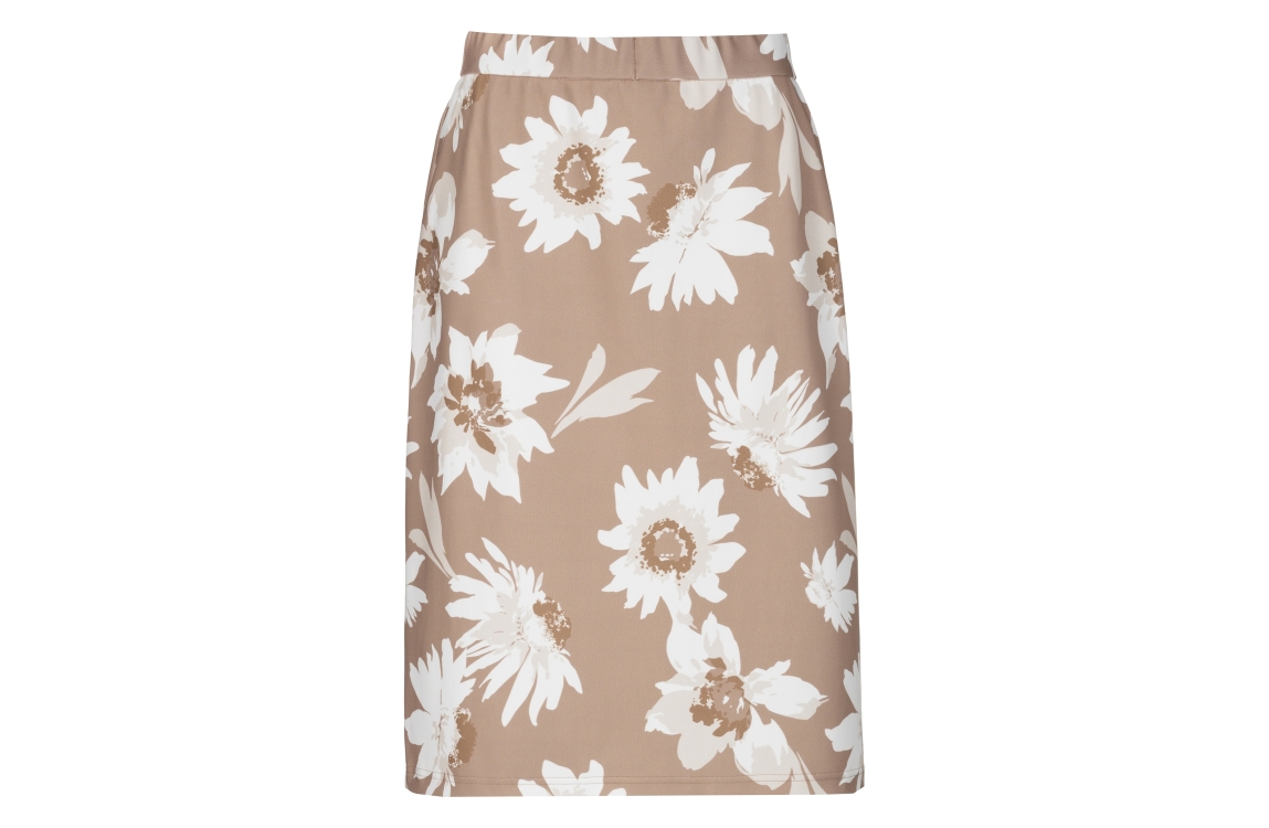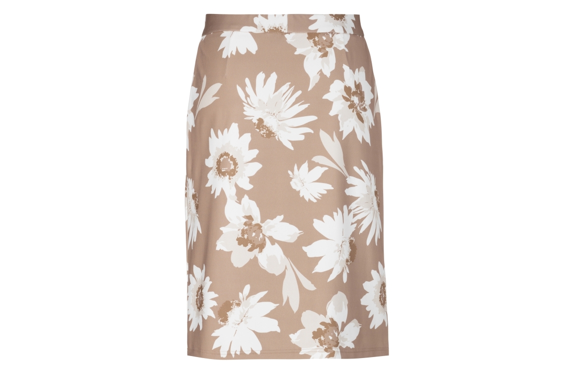 Frank Walder rok S62104201. Dit tailored fit model sluit door middel van een elastische boord. Deze beige rok van Frank Walder is all-over bewerkt met een bloemenprint en is uitgevoerd in stretchkwaliteit.