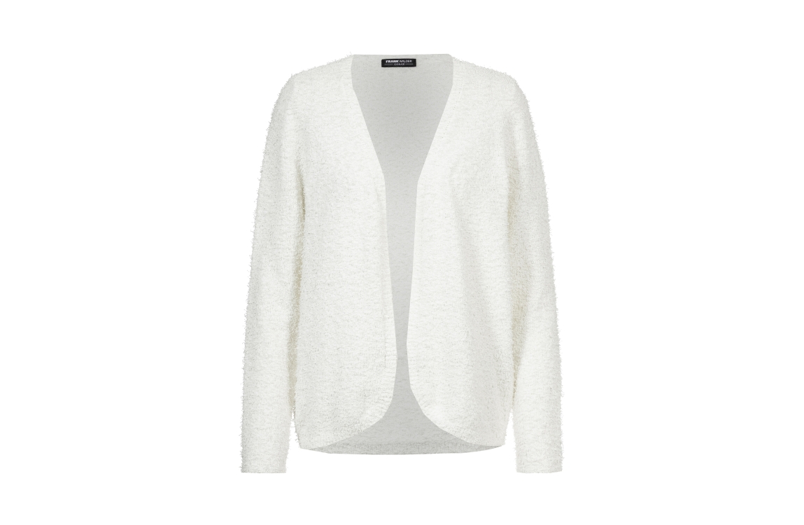 Frank Walder vest S62503055 00902. Dit rechtvallende model heeft een ronde (open) halslijn en lange mouwen. Deze witte vest van Frank Walder is uitgevoerd met een structuur.