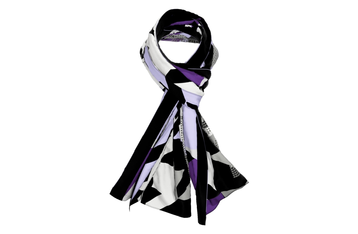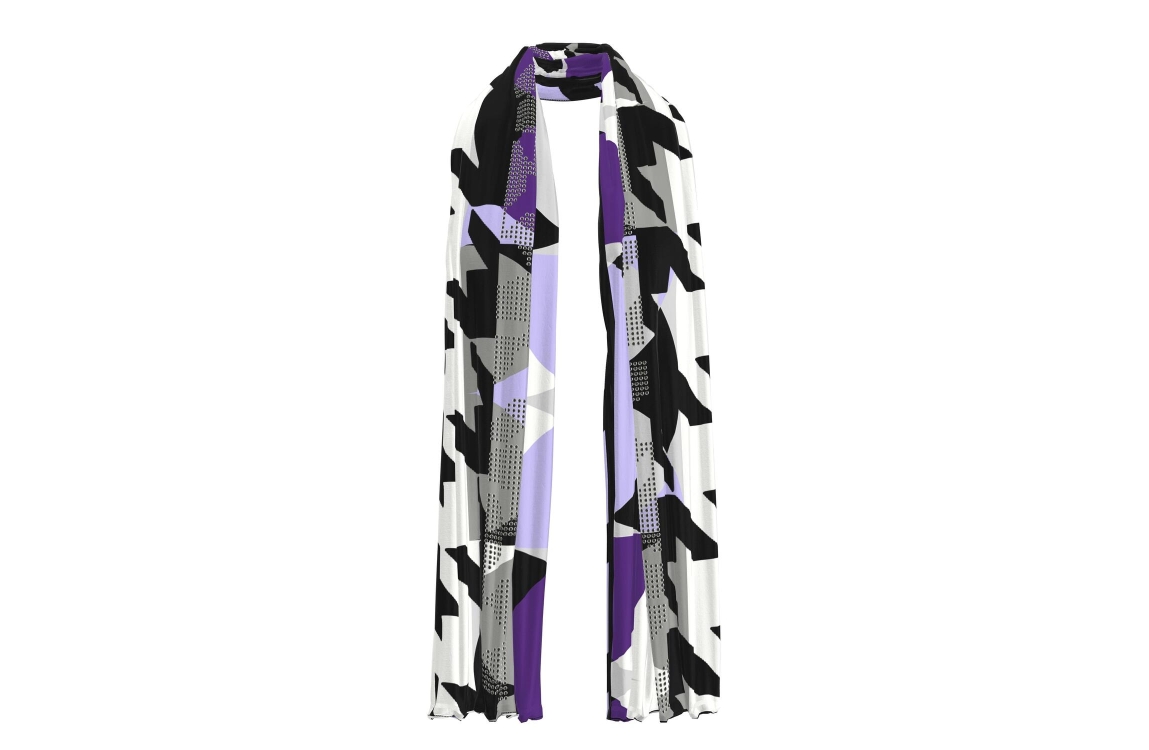 Frank Walder sjaal w42308770. Dit rechthoekige model is bewerkt met de kleuren paars, zwart en wit en is uitgevoerd in een pied de poule print.