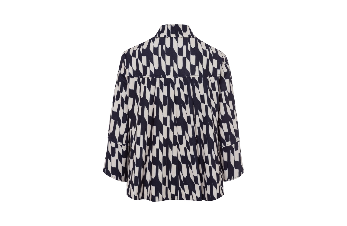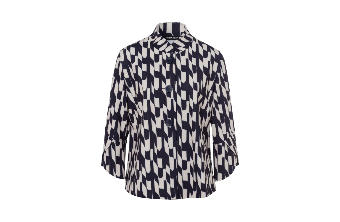 Frank Walder blazer W51108303. Dit rechtvallend model is voorzien van een opstaande ronde kraag en heeft driekwart mouwen afgewerkt met split detail. Deze blauwe/beige blazer van Frank Walder is all-over bewerkt met een grafische print en sluit door middel van knopen.