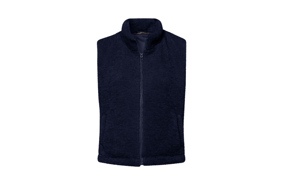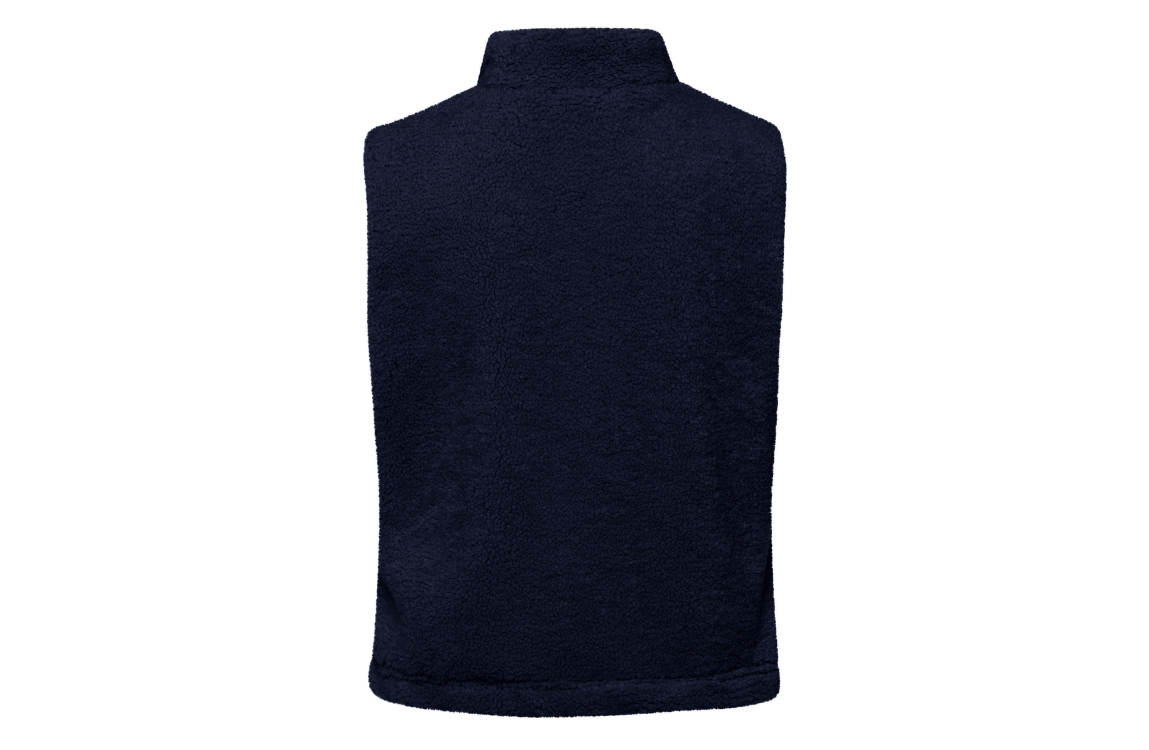 Dit rechtvallende model is voorzien van een opstaande kraag en is mouwloos. Deze donker blauwe gilet van Frank Walder sluit door middel van een rits en is uitgevoerd in teddy materiaal.