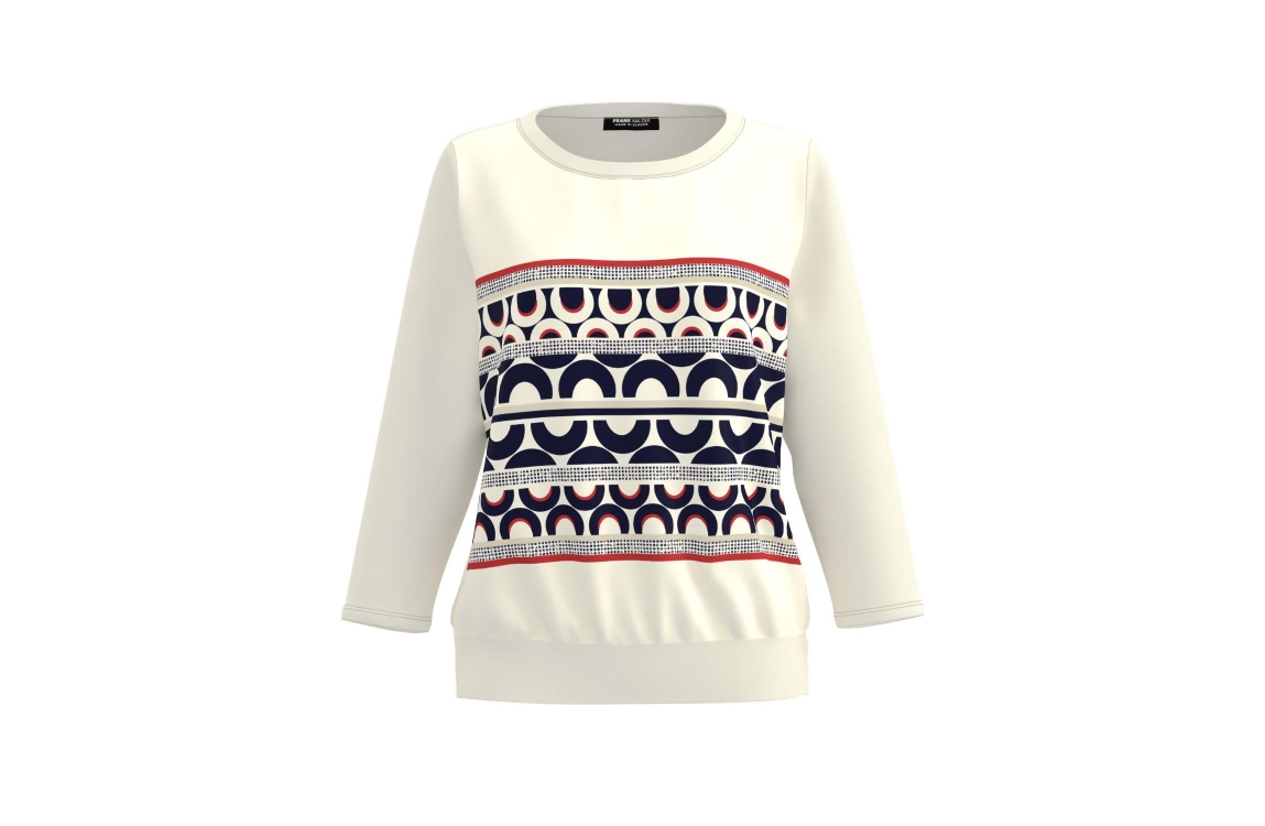 Frank Walder W52Blusenshirts 643/036 Red print. Dit rechtvallende model heeft een ronde hals en driekwart mouwen. Dit witte shirt van Frank Walder is aan de voorzijde bewerkt met een grafische print in verschillende kleuren. Dit model is uitgevoerd in stretch kwaliteit en heeft afgewerkte boorden.