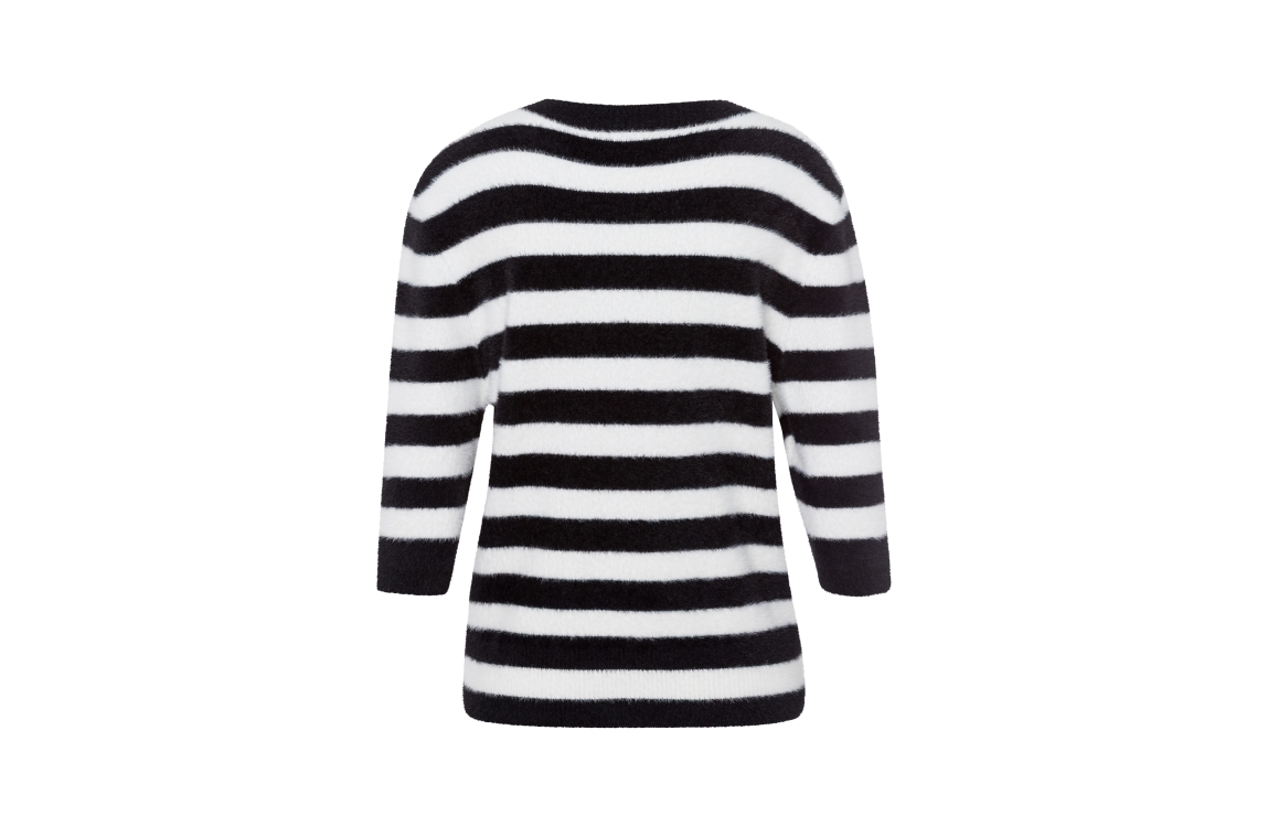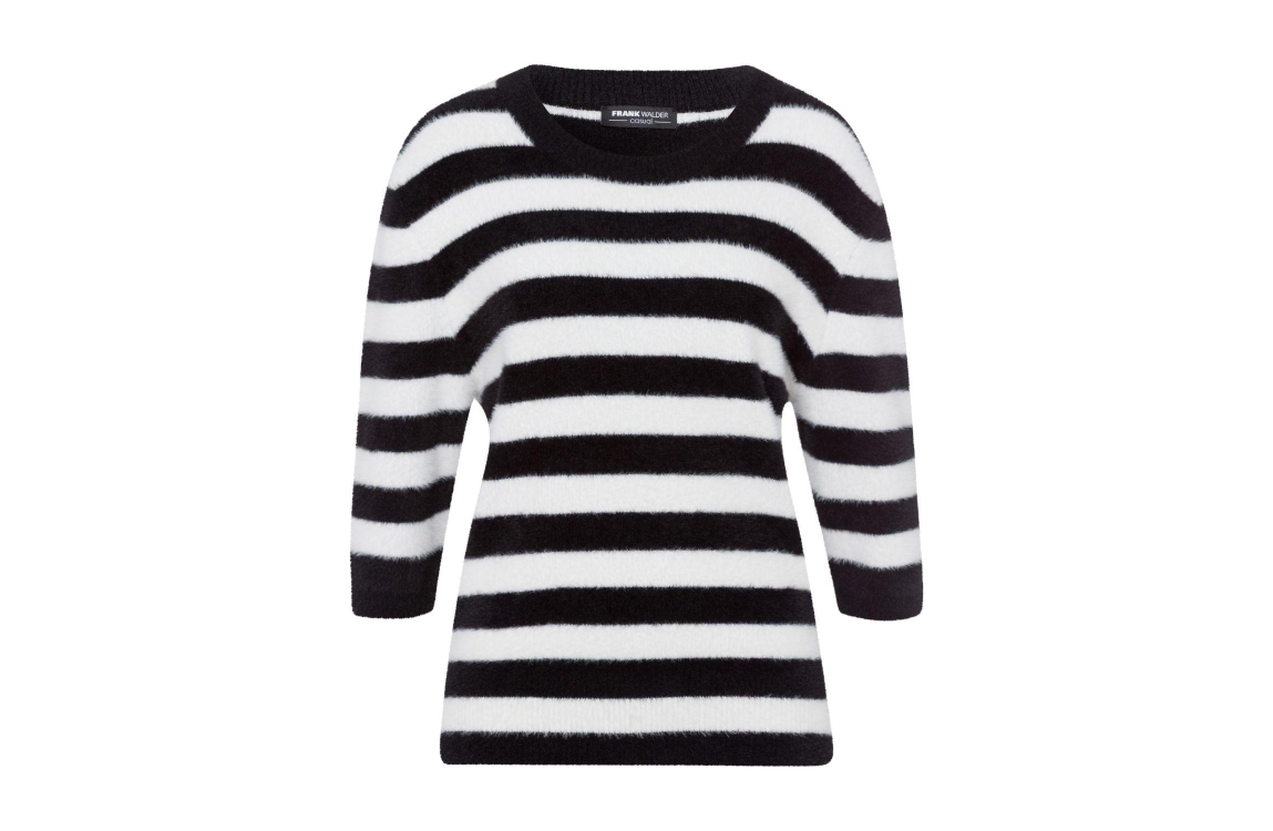 Frank Walder WX52Strick 038/099 Black print. Dit rechtvallende model is voorzien van een ronde hals en heeft lange mouwen. Deze zwart/wit gestreepte trui van Frank Walder is gemaakt van een fluffy materiaal.