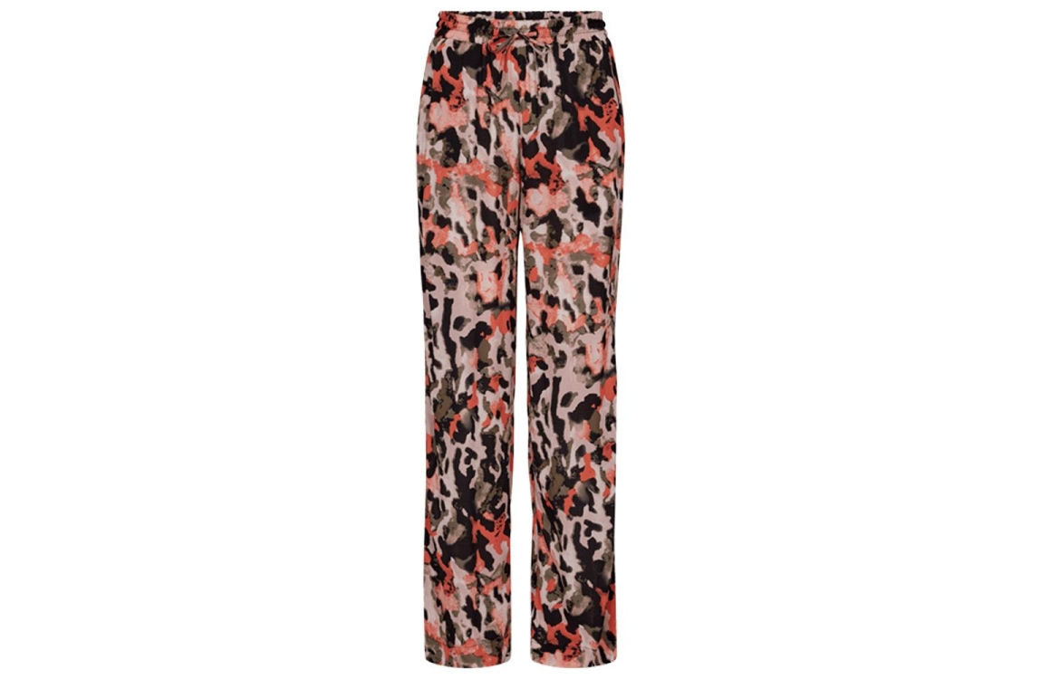 Freequent broek Lexey. Dit soepelvallende model sluit aan de bovenzijde door middel van een elastische band en koorden. Deze rode broek van Freequent is voorzien van een organische print en uitgevoerd in een luchtig materiaal voorzien van zakken.