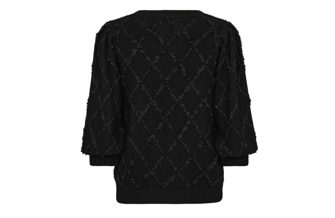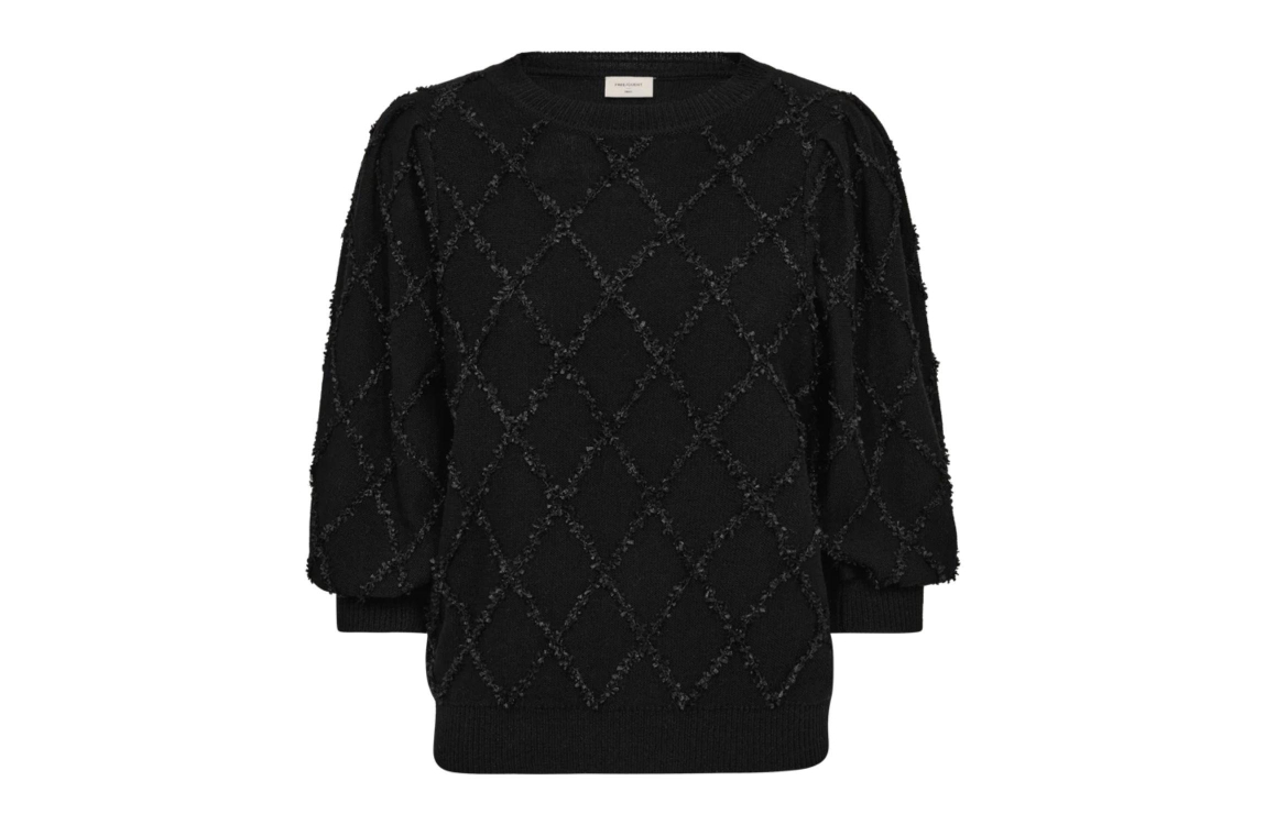 Freequent Effect yarn, puff sleeve Black. Dit rechtvallende model is voorzien van een ronde hals en heeft driekwart mouwen. Deze zwarte pullover van Freequent is all-over bewerkt met ruffles. Dit model is afgewerkt met ribgebreide boorden.