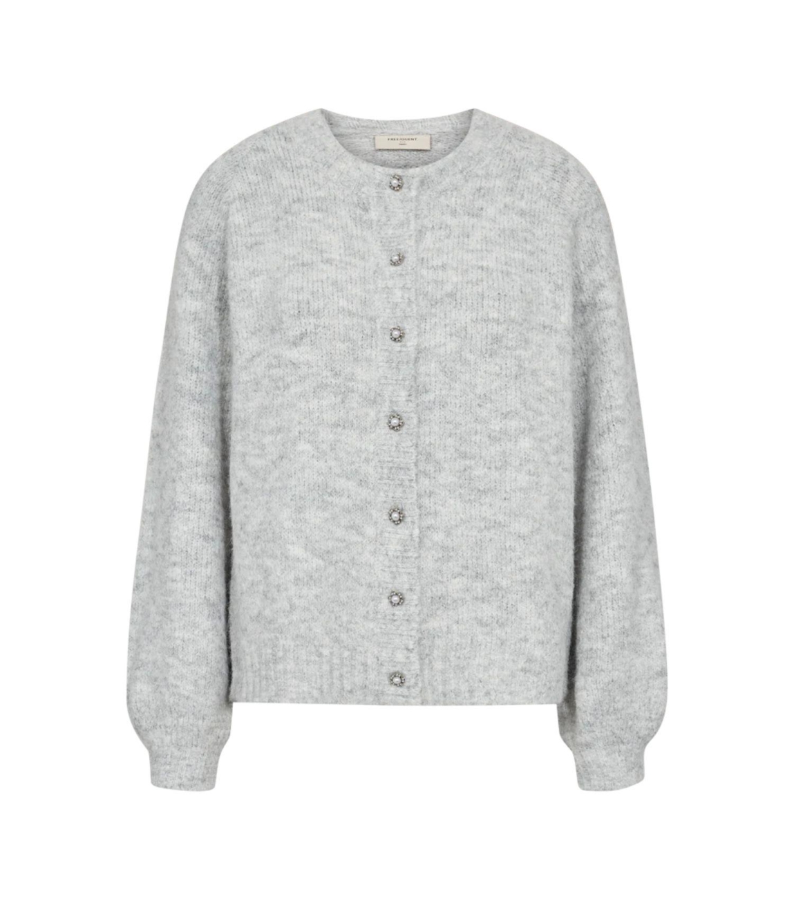 Freequent Fancy button Light grey melange. Dit rechtvallende model is voorzien van een ronde hals en heeft lange mouwen. Dit grijze vest van Freequent sluit aan de voorzijde door middel van knopen. Dit model is afgewerkt met ribgebreide boorden.