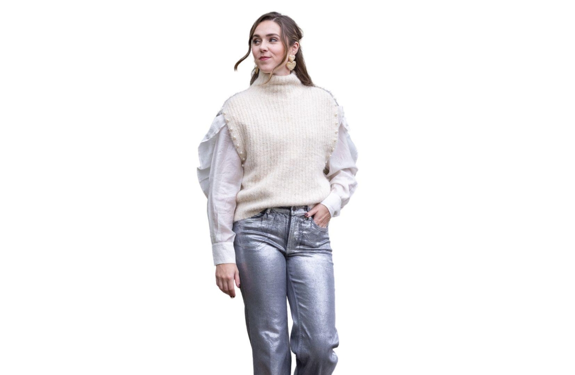 Freequent 206801 GRSLULU spencer. Dit rechtvallende model is voorzien van een kraag en is mouwloos. Deze gebreide beige kleurige spencer van Freequent is bij de mouwen afgewerkt met parels.