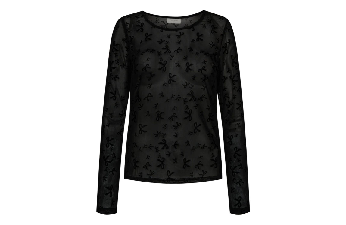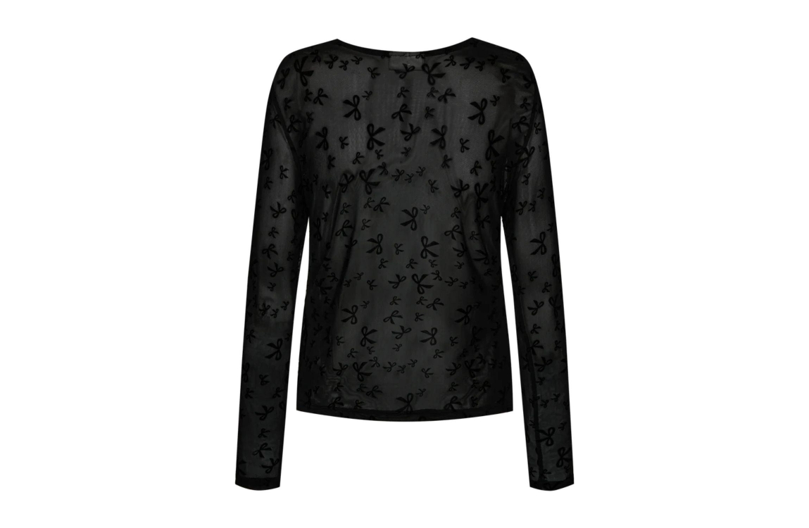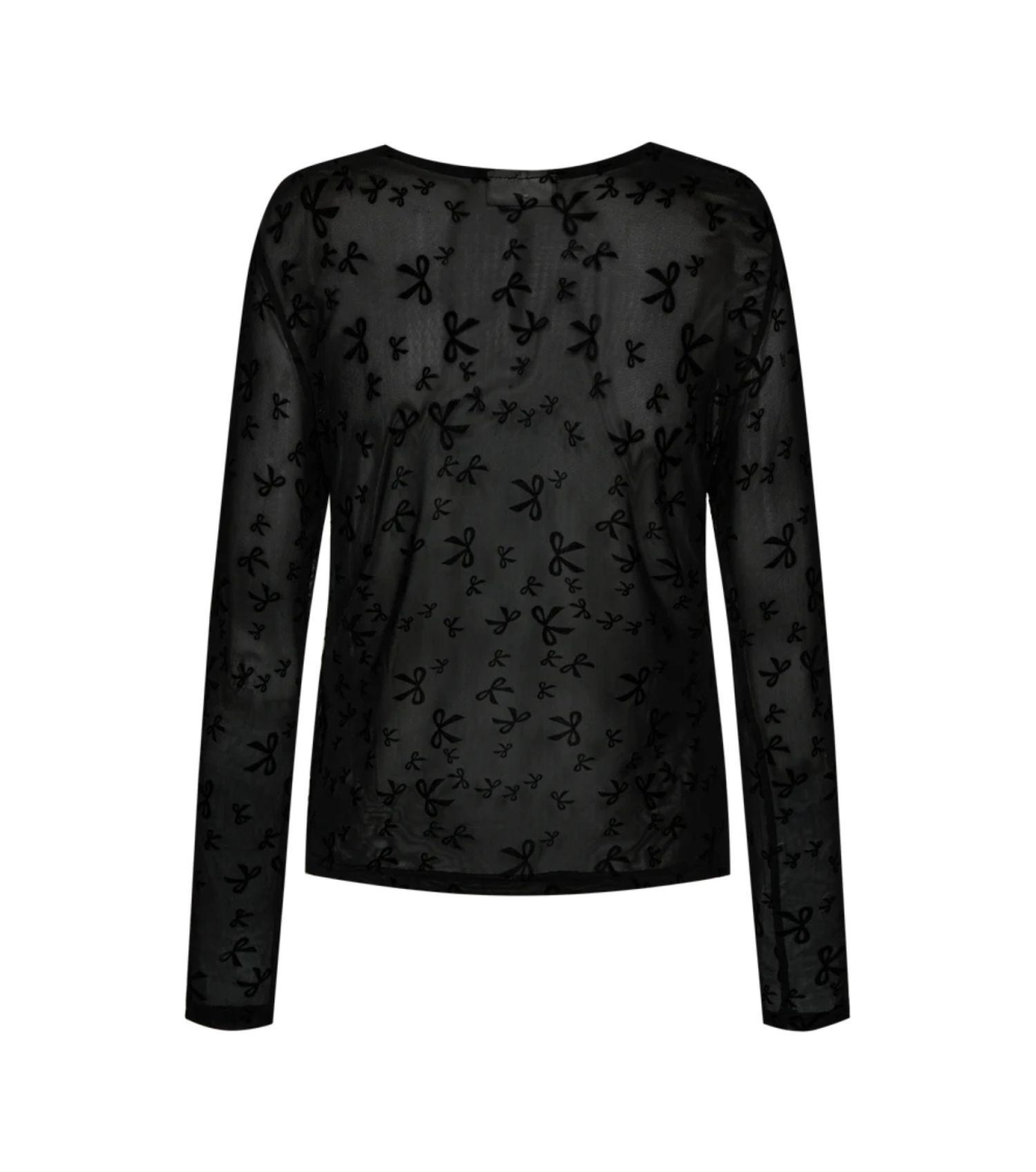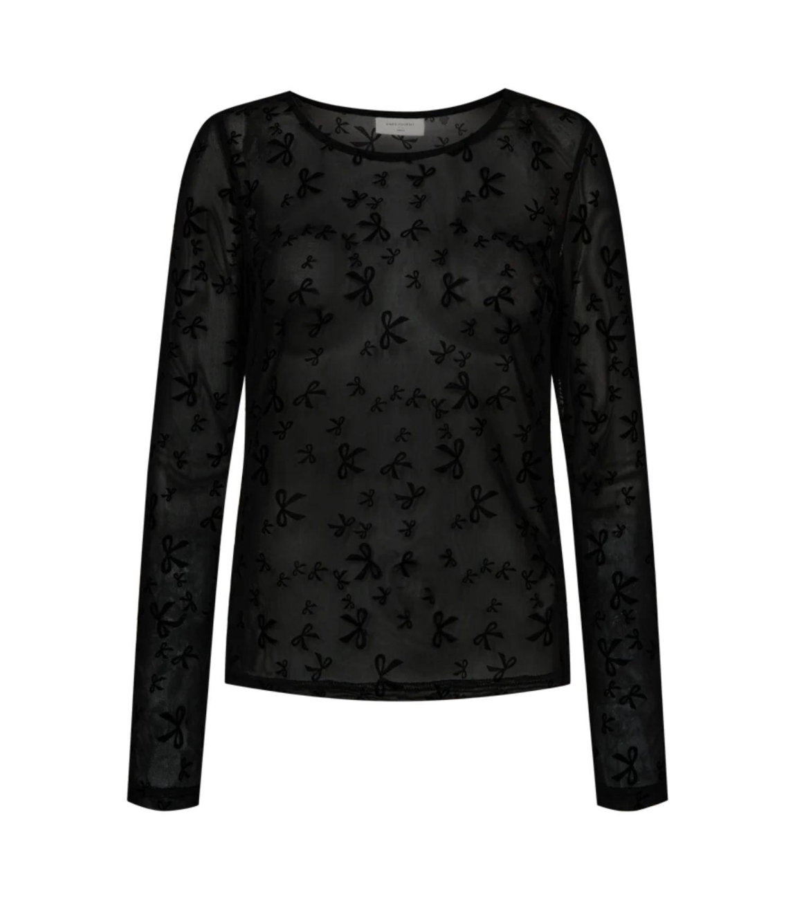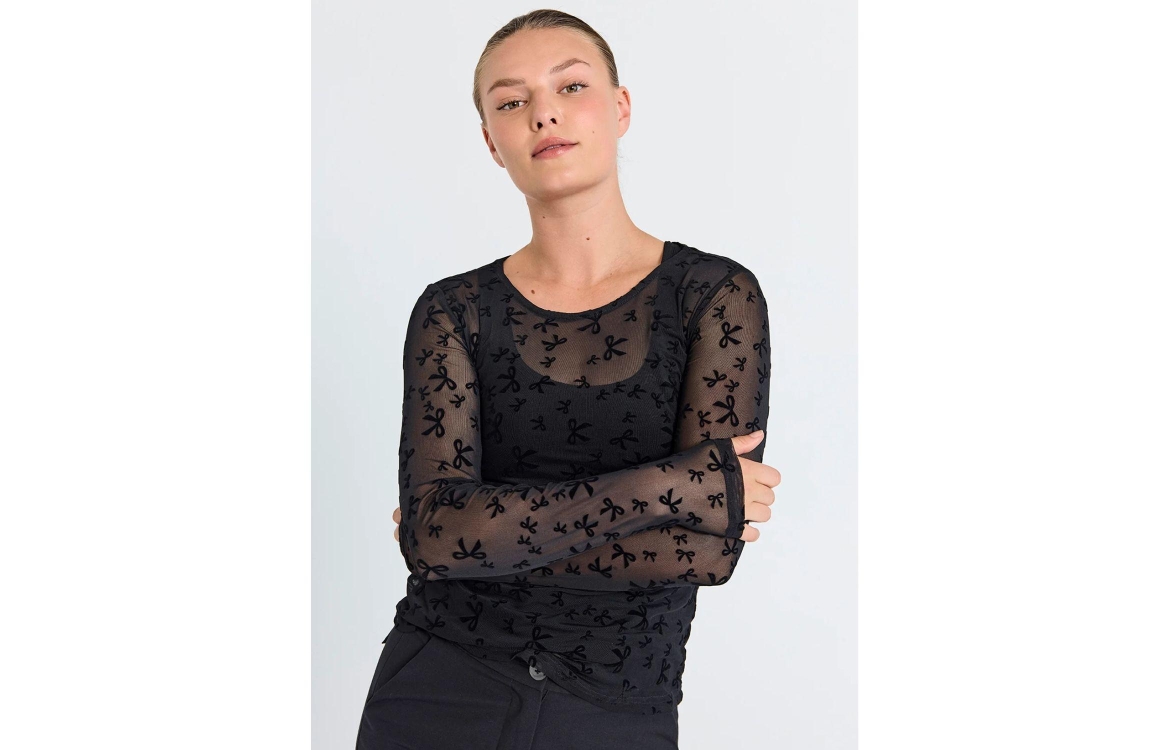 Freequent Flock printed mesh Black. Dit aangesloten model is voorzien van een ronde hals en lange mouwen. Deze zwarte top van Freequent is gemaakt in een transparante en rekbare mesh-stof. Dit model is all-over bewerkt met een strikjes patroon.