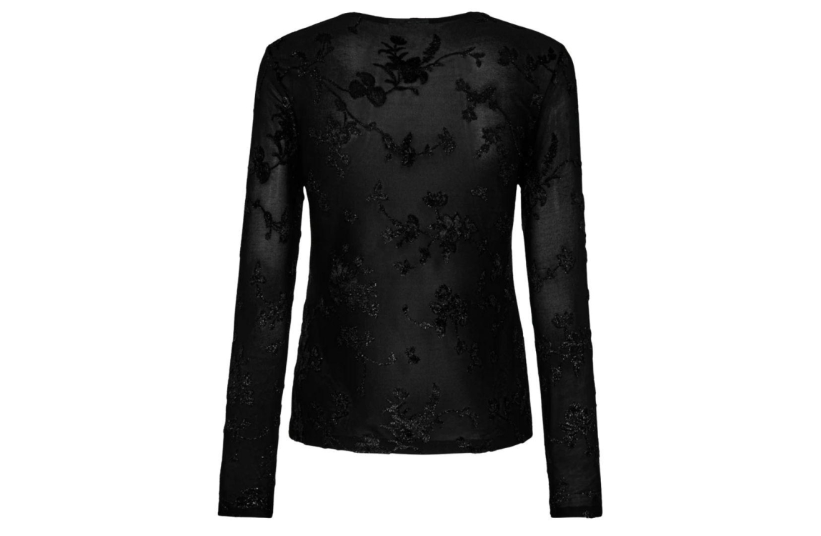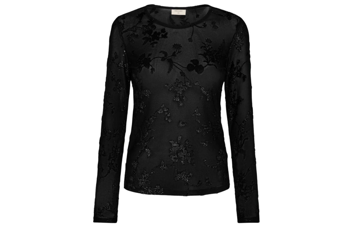 Freequent top FQBISKA 207124. Dit aangesloten model is voorzien van een ronde hals en heeft lange mouwen. Deze zwarte mesh top van Freequent is all-over bewerkt met fluwelen borduursel.