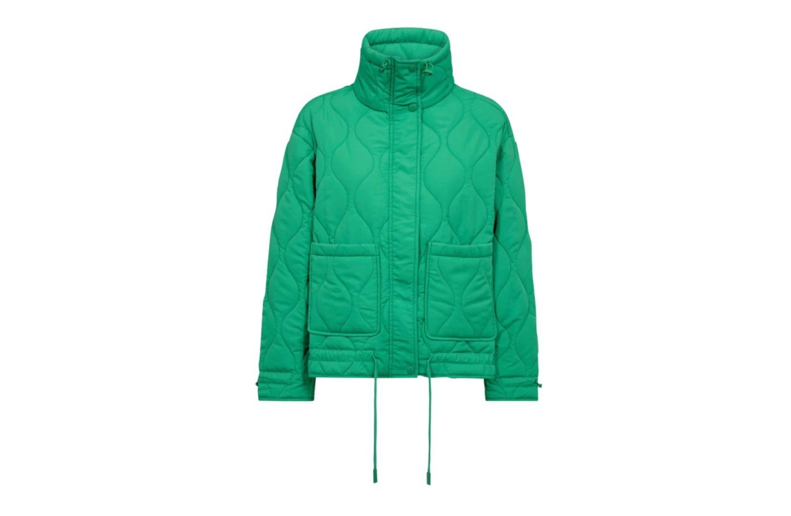 Freequent jacket FQBLOB 203625. Dit rechtvallend model is voorzien van een hoge kraag en heeft lange mouwen. Deze felgroene jacket van Freequent sluit door middel van een rits en knopen, beschikt over twee zakken en trekkoorden bij de kraag en aan de onderzijde. Dit model is bewerkt met een patroon en is gewatteerd uitgevoerd.