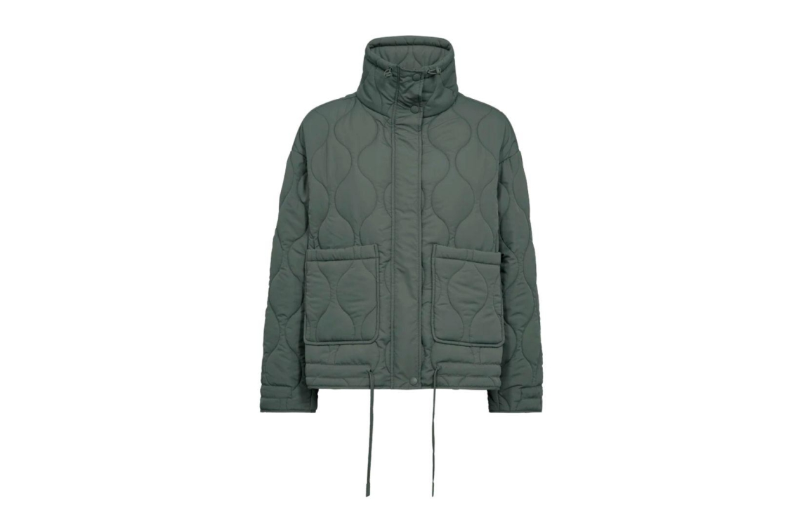 Freequent jacket FQBLOB 203625. Dit rechtvallend model is voorzien van een hoge kraag en heeft lange mouwen. Deze donkergroene jacket van Freequent sluit door middel van een rits en knopen, beschikt over twee zakken en trekkoorden bij de kraag en aan de onderzijde. Dit model is bewerkt met een patroon en is gewatteerd uitgevoerd.