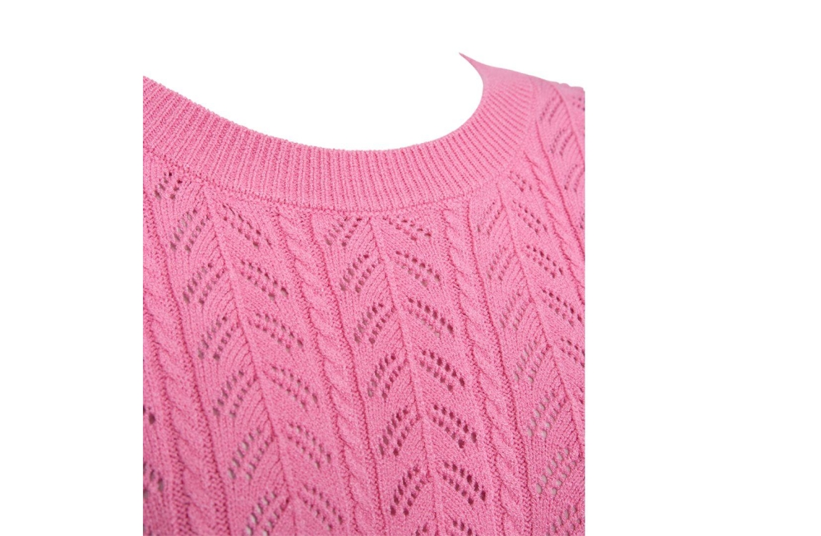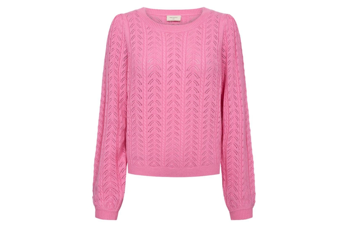 Freequent pullover 207380. Dit rechtvallende model heeft een ronde halslijn en lange mouwen. Deze roze pullover van Freequent is uitgevoerd in een fijn opengewerkt ajour-patroon en is afgewerkt met ribgebreide boorden.