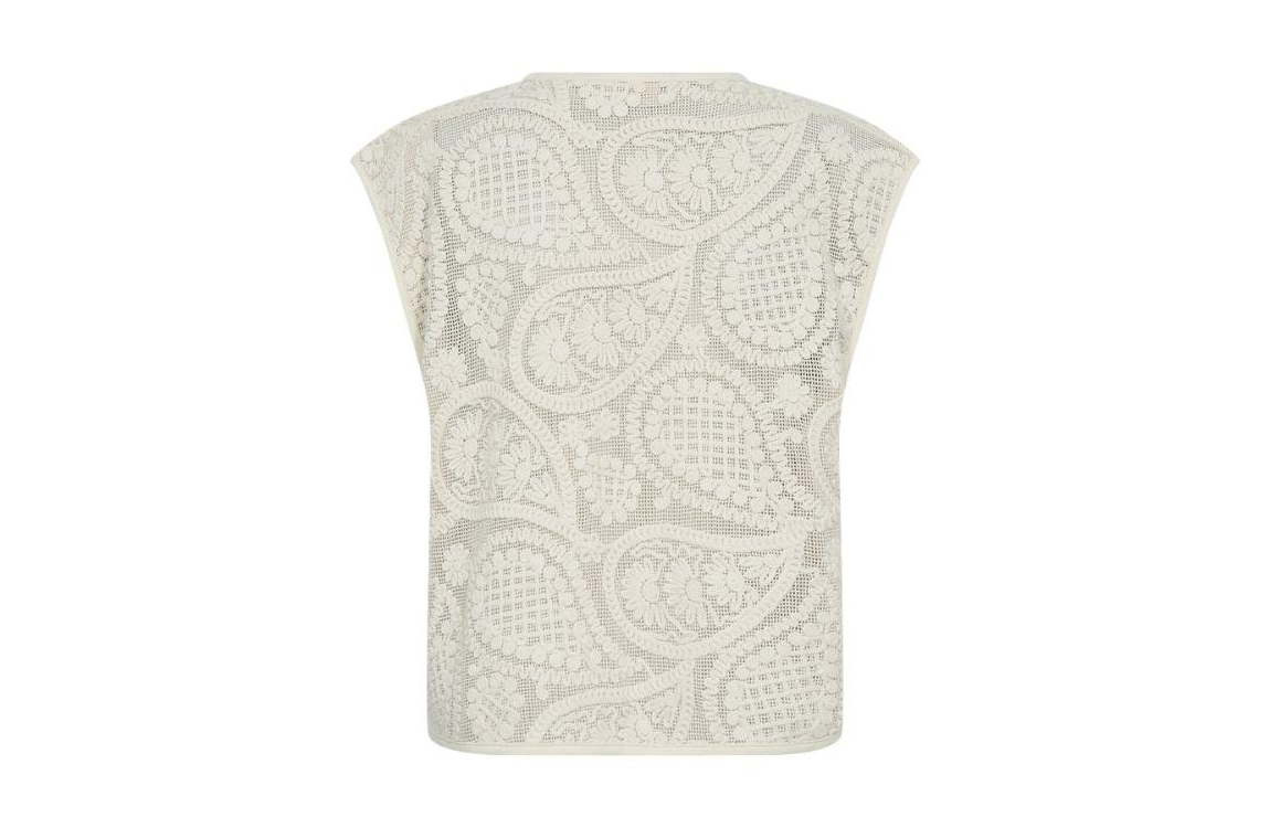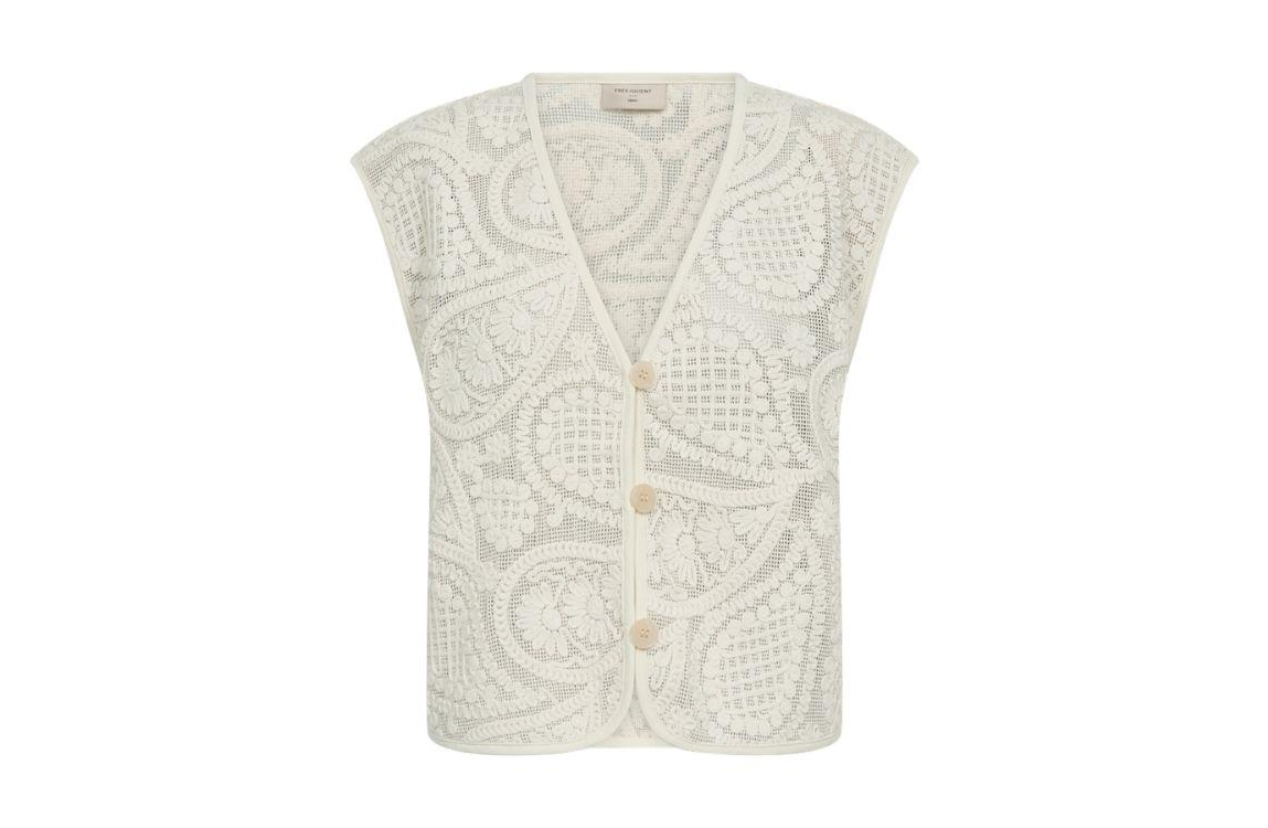 Freequent gilet 208009. Het rechtvallende model heeft een V-hals en is mouwloos. Dit beige gilet van Freequent is uitgevoerd in een opengehaakte kwaliteit en sluit aan de voorzijde door middel van knopen.