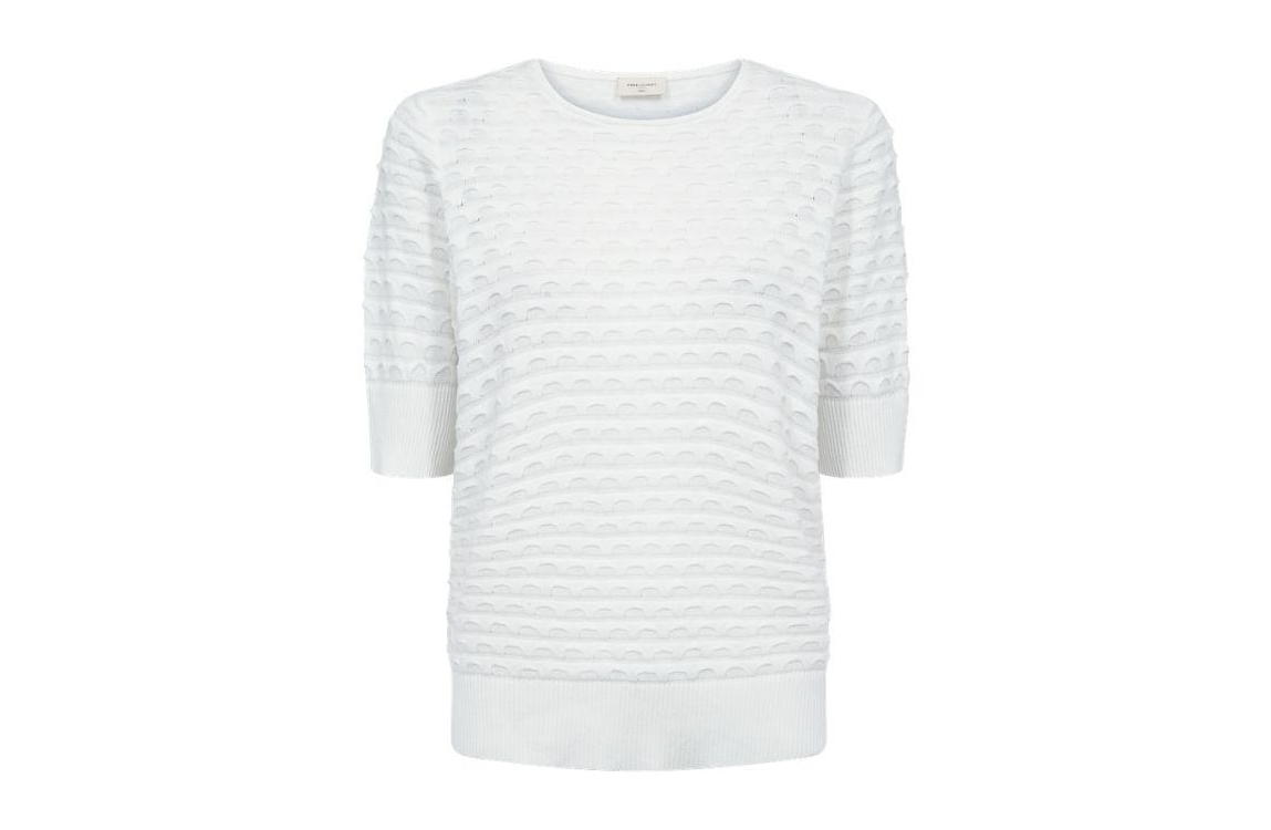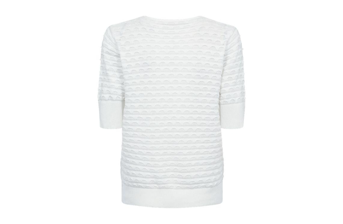 Freequent pullover 205789. Dit rechtvallende model heeft een ronde halslijn en korte mouwen. Deze off-white top van Freequent is uitgevoerd met een structuur en is afgewerkt met ribgebreide boorden.