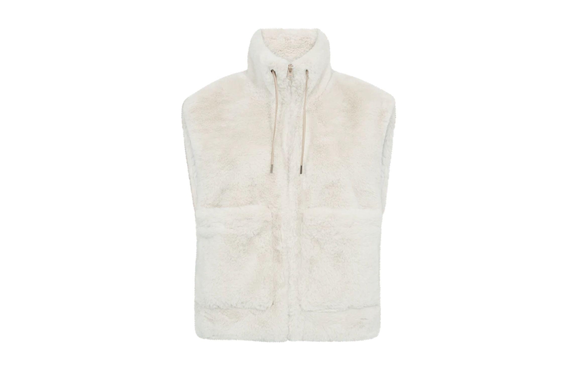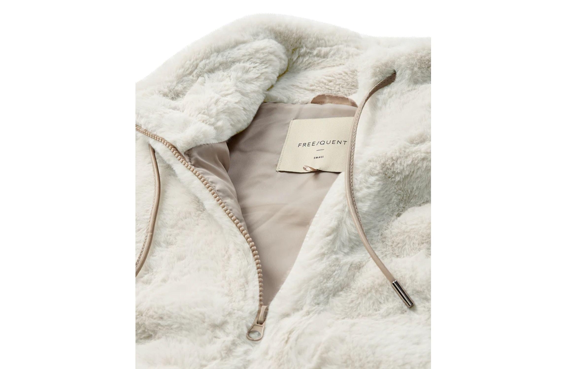 Freequent FQFONY-WAISTCOAT 2080 Moonbeam. Dit rechtvallende model is voorzien van een opstaande kraag met trekkoord en is mouwloos. Deze beige gilet van Freequent sluit door middel van een rits en heeft twee steekzakken aan de voorzijde. Dit model is uitgevoerd in een faux fur kwaliteit.