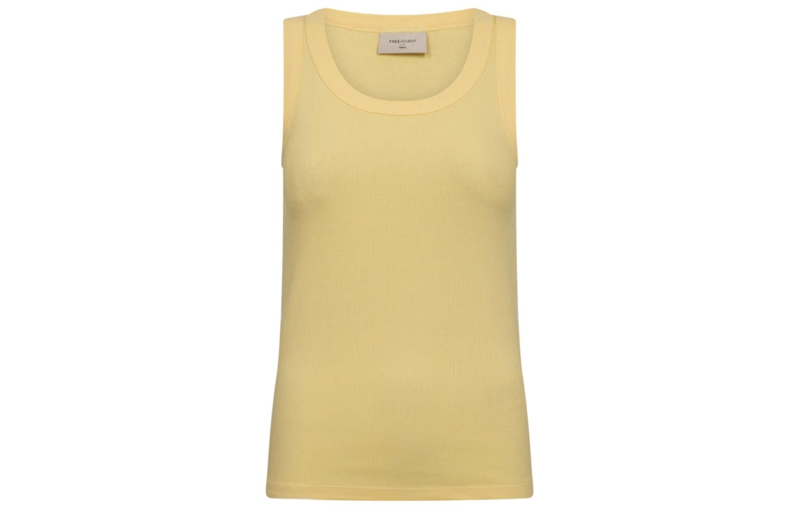Freequent FQHI-TOP Golden Haze. Dit aangesloten model is voorzien van een ronde hals en is mouwloos. Deze gele top van Freequent heeft brede schouderbanden en is gemaakt van een geribbeld materiaal.
