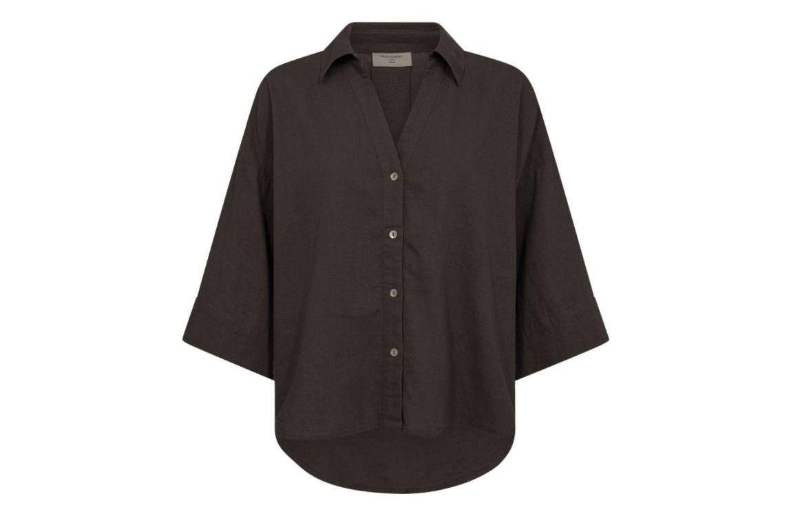 Freequent blouse/shirt 207870. Dit wijdvallende model heeft een kraag en korte mouwen met gedropte schoudernaden. Deze koffiebruine blouse/shirt van Freequent sluit aan de voorzijde door middel van knopen en is gemaakt van linnen en viscose.