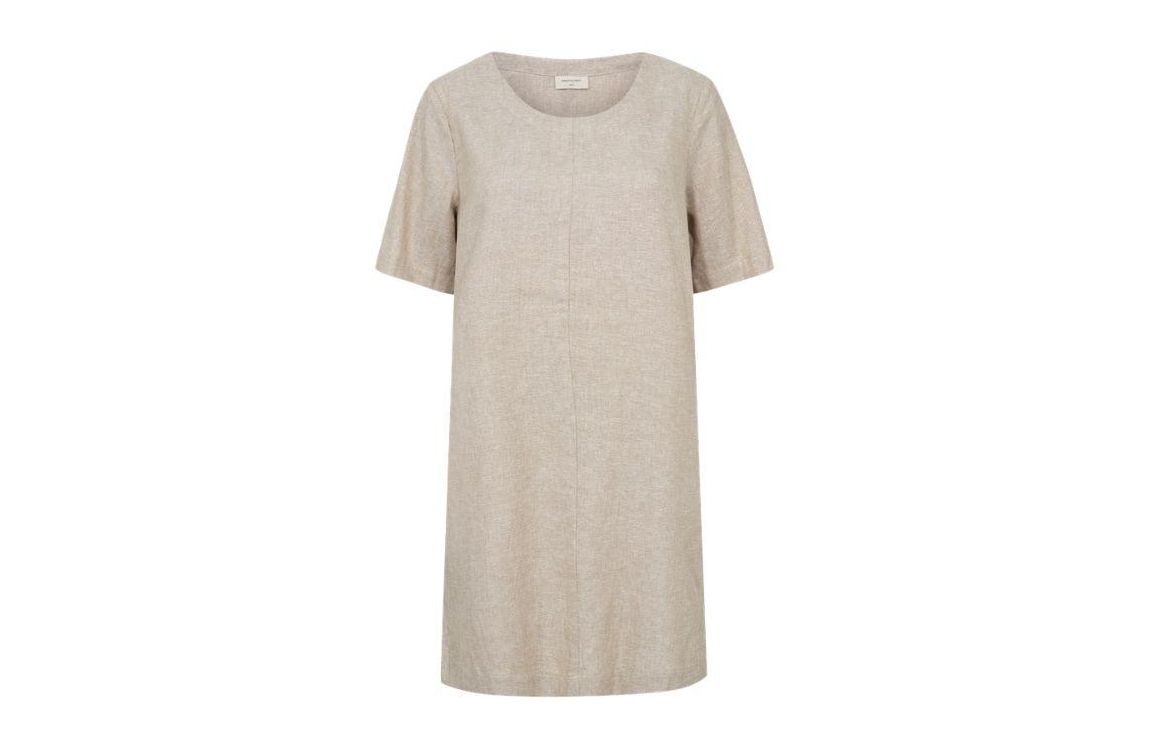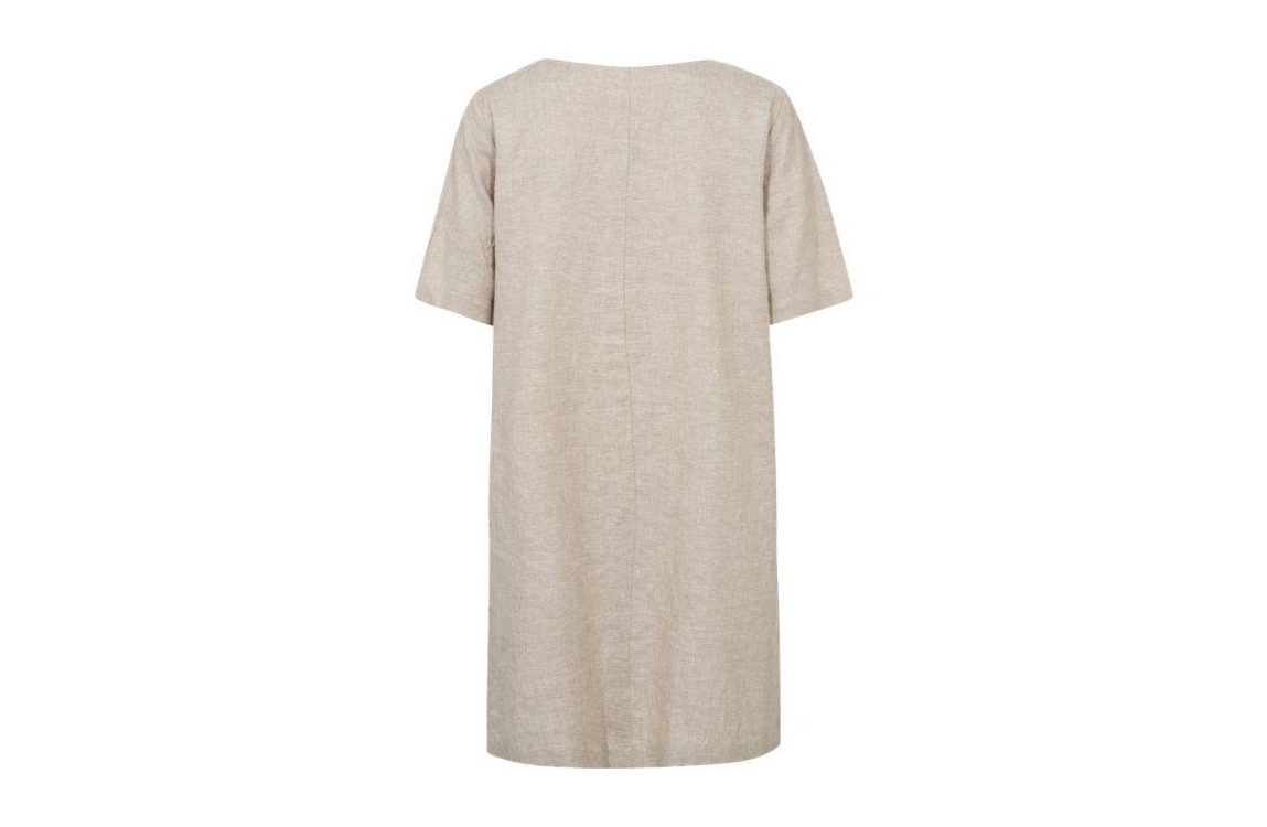 Freequent jurk 208144. Dit wijdvallende model heeft een ronde halslijn en korte mouwen. Deze zandkleurige jurk van Freequent is all-over bewerkt met zilverkleurige glitterdraad en is voorzien van twee steekzakken.