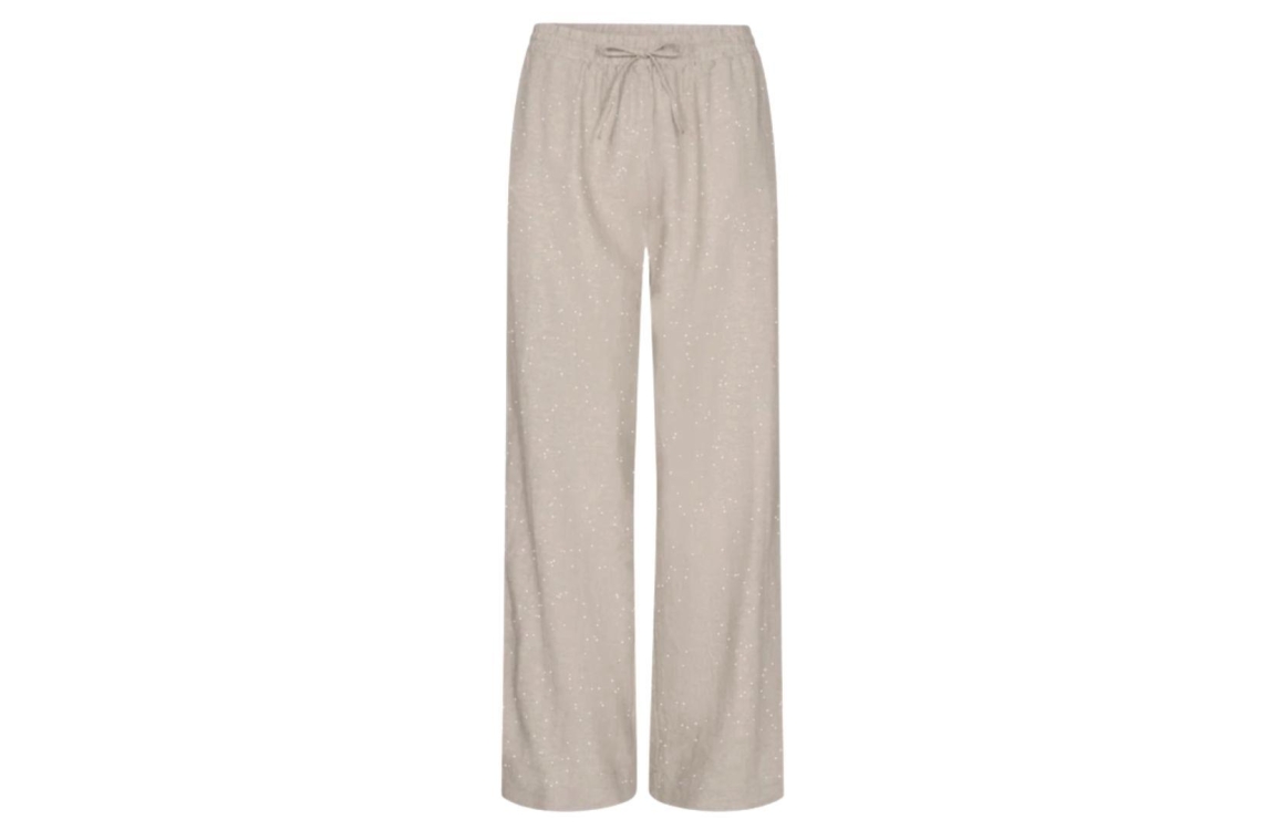 Freequent FQLAVASI-PANTS 208294. Dit soepeldevallende model sluit door middel van een elastische boord met trekkoord en heeft wijde pijpen. Deze beige broek van Freequent is afgewerkt met glitters.