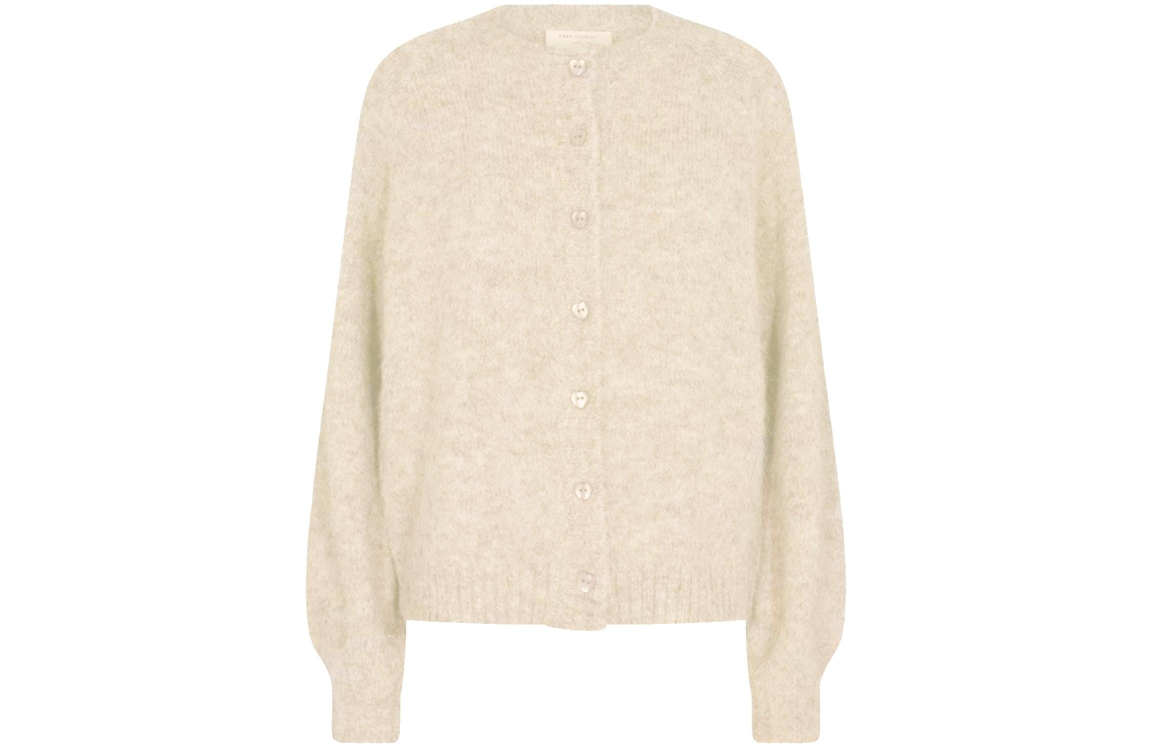 Freequent 202236 Louisa vest. Dit rechtvallende model is voorzien van een ronde hals en heeft lange mouwen. Dit beige kleurige vest van Freequent sluit aan de voorzijde door middel van knopen. Dit model is afgewerkt met ribgebreide boorden.