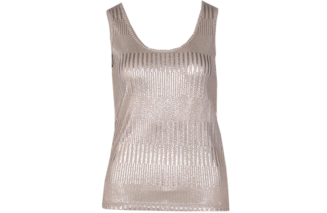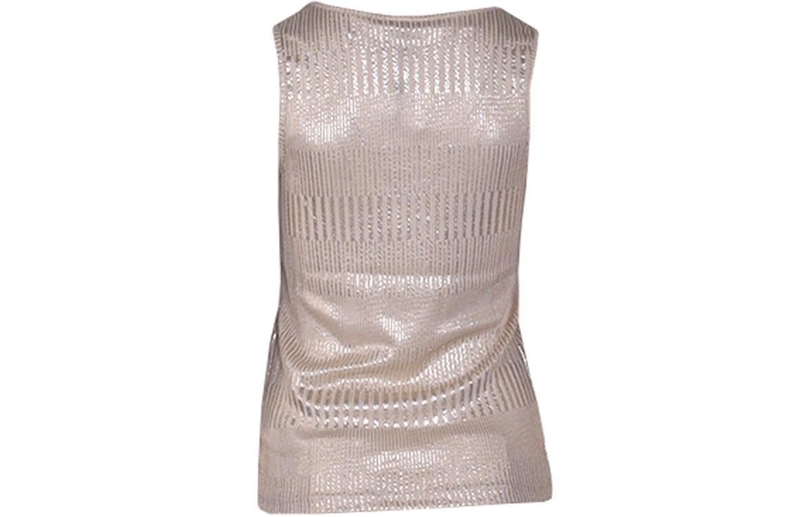 Freequent top FQMATTER 206042. Dit rechtvallend model is voorzien van een ronde hals en is mouwloos. Deze beige top van Freequent is bewerkt met metallic all-over.