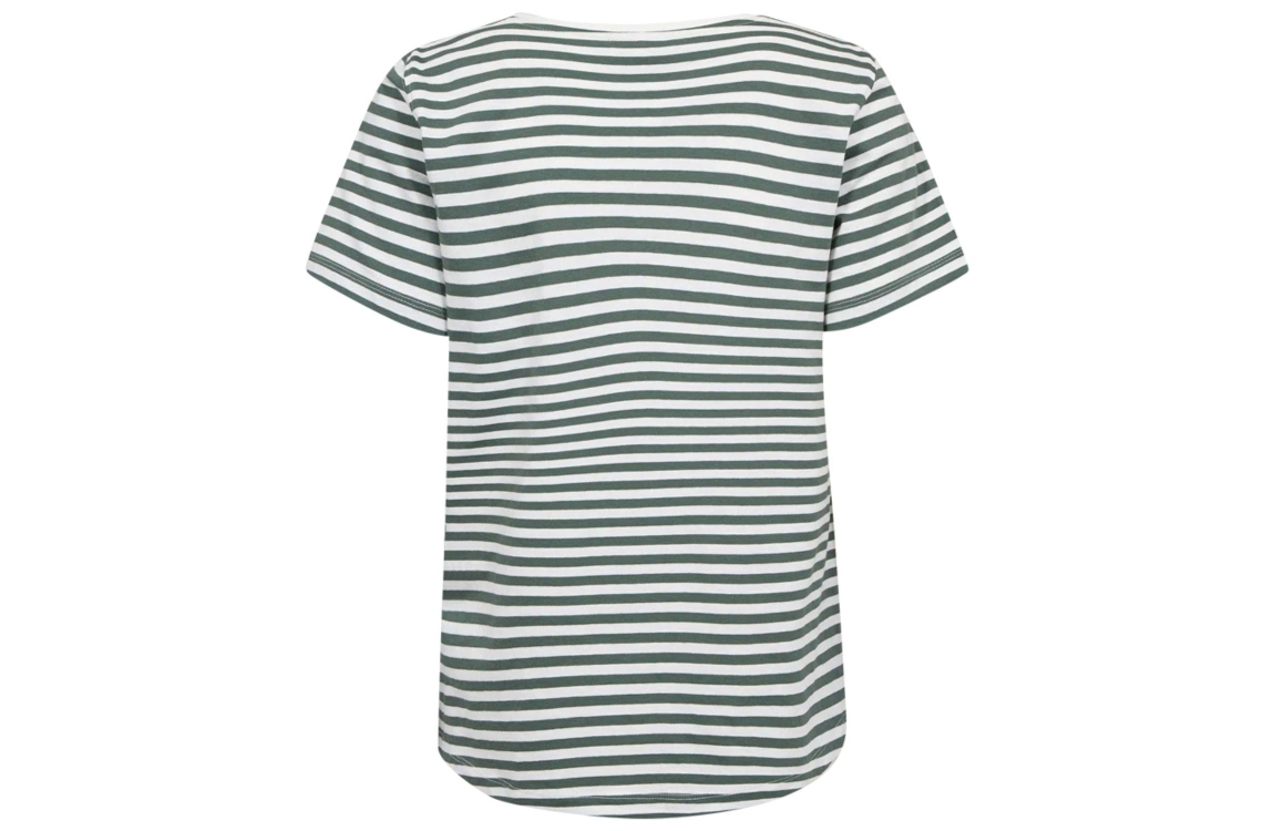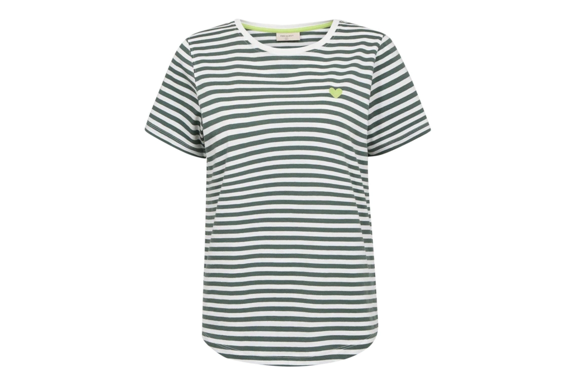 Freequent FQMIAN-TEE Star Off-white w. Dark Forest. Dit rechtvallende model heeft een ronde halslijn en korte mouwen. Dit groen gestreepte T-shirt van Freequent is afgewerkt met eenn geborduurd hartje op de borst