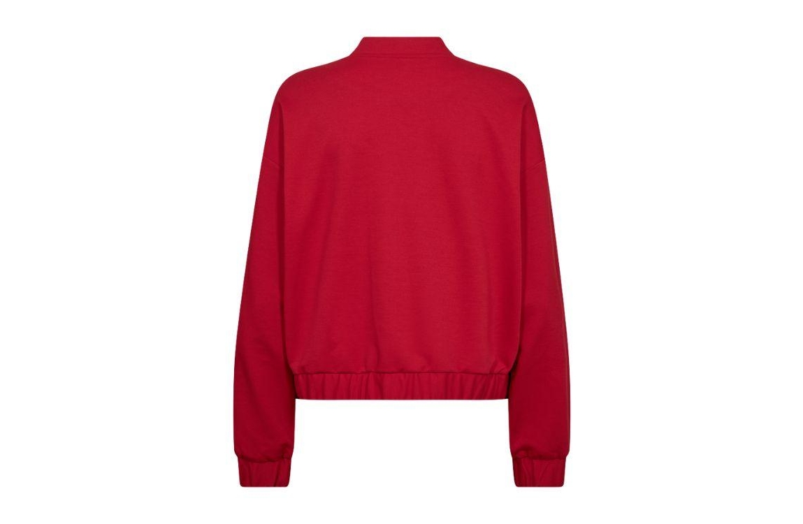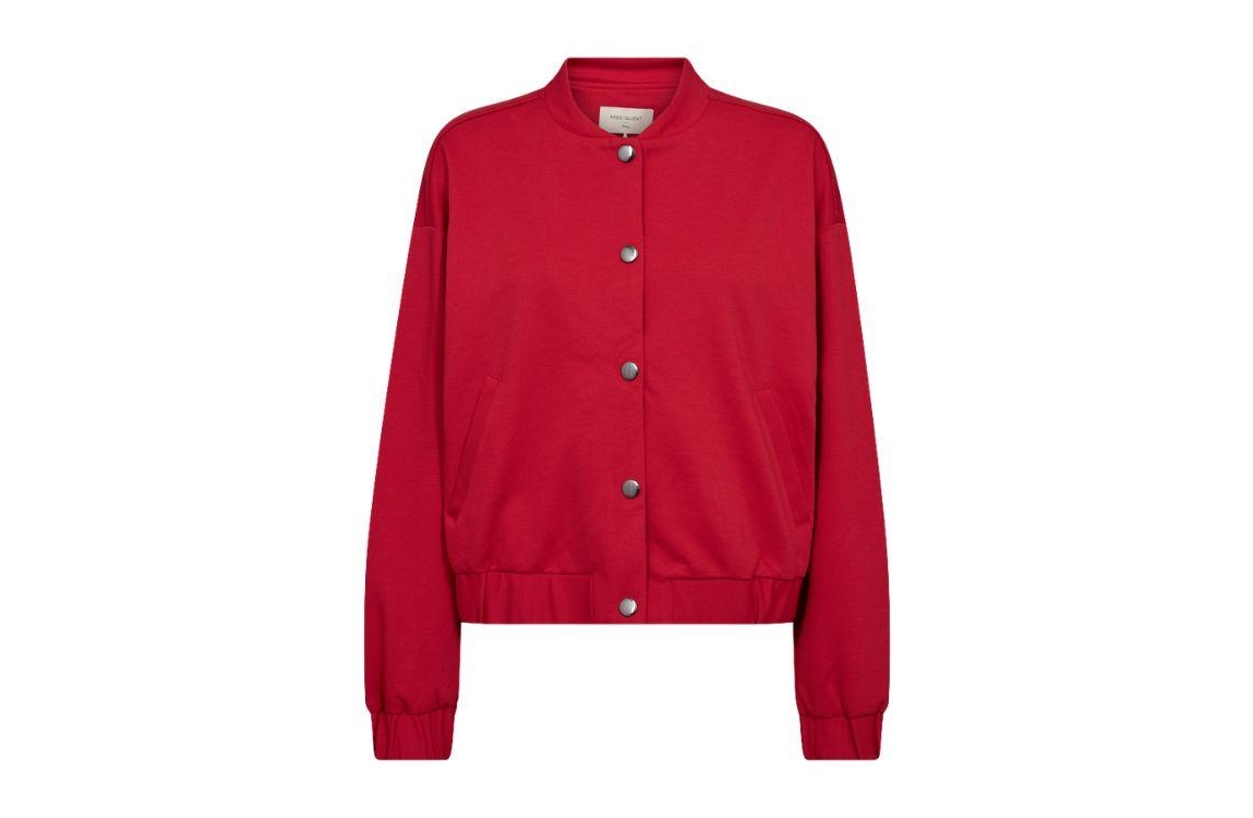 Freequent bomberjas 20602 1919. Dit bomber model heeft een ronde halslijn en lange mouwen. Deze roodkleurige bomberjas sluit aan de voorzijde door middel van knopen en is voorzien van twee schuine steekzakken. Het model is voorzien van elastische boorden.