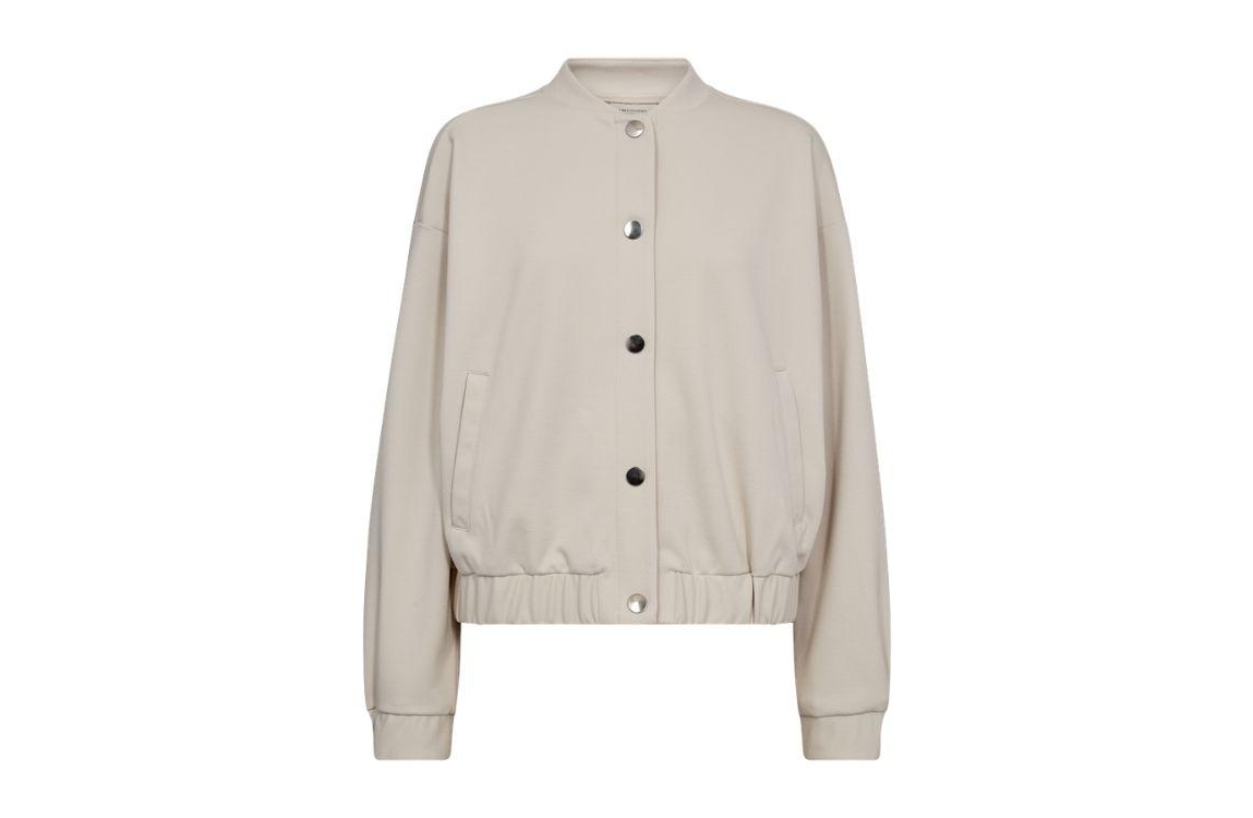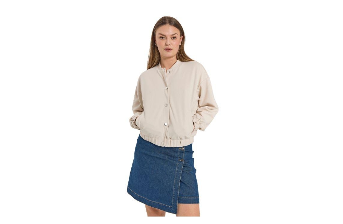 Freequent bomberjas 20602 2080. Dit bomber model heeft een ronde halslijn en lange mouwen. Deze lichtbeige bomberjas sluit aan de voorzijde door middel van knopen en is voorzien van twee schuine steekzakken. Het model is voorzien van elastische boorden.