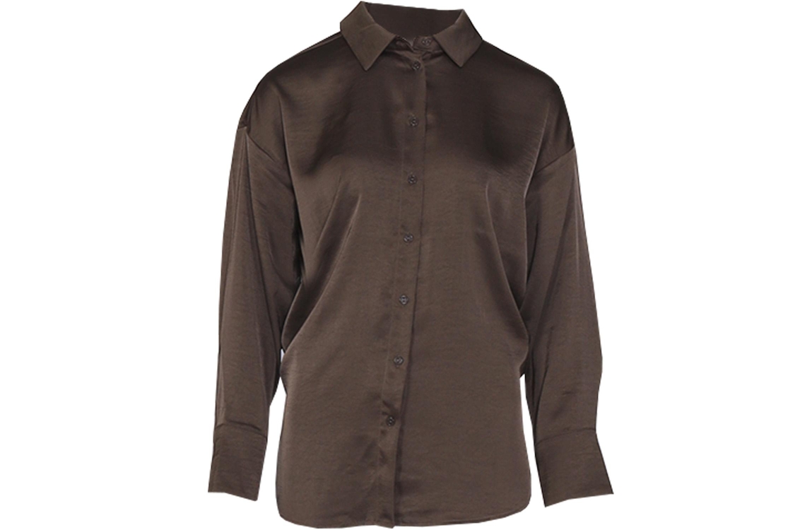 Freequent shirt FQNIRA 204492. Dit rechtvallend model is voorzien van een kraag en heeft lange mouwen. Deze bruine shirt van Freequent is uitgevoerd in een glanzende kwaliteit en sluit door middel van knopen.