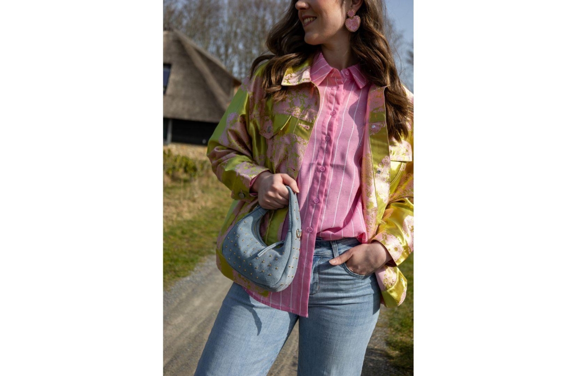 Freequent blouse 207427. Dit rechtvallende model heeft een kraag en lange mouwen. Deze roze blouse van Freequent is uitgevoerd in een streepprint en is all-over bewerkt met strass-steentjes. Het model sluit aan de voorzijde door middel van knopen en is afgewerkt met manchetten.