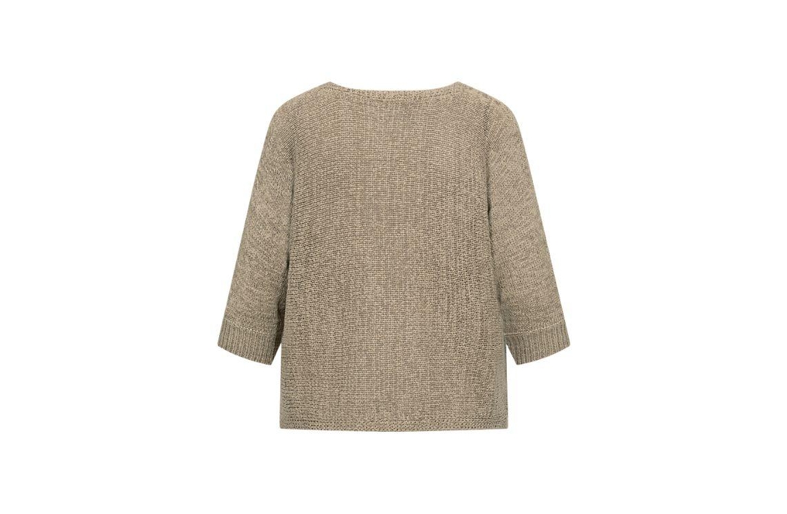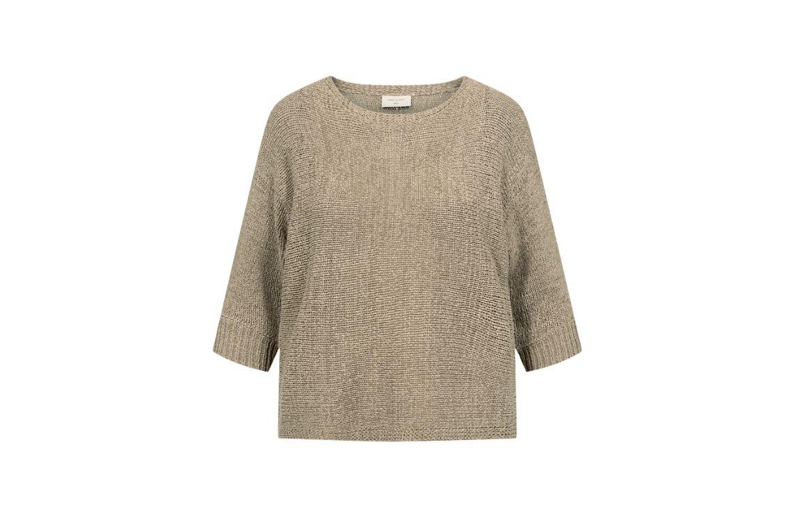 Freequent trui 205788. Dit rechtvallende model heeft een ronde halslijn en driekwart mouwen. Deze zilver-/bruinkleurige trui van Freequent is uitgevoerd in een fijn breisel en is afgewerkt met ribgebreide mouwboorden.