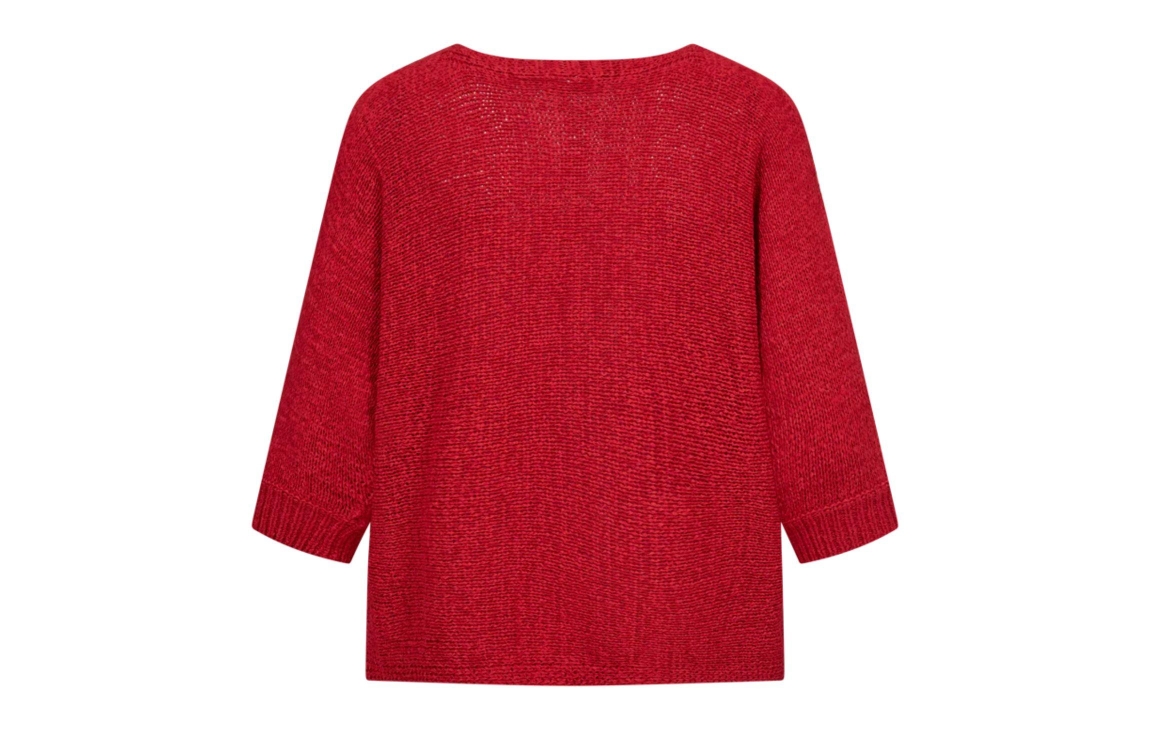 Freequent FQTAPPER-PULLOVER True Red. Dit rechtvallende model heeft een ronde halslijn en driekwartmouwen. Deze rode pullover van Freequent is afgewerkt met zijzakken en is uitgevoerd in een gebreid materiaal.