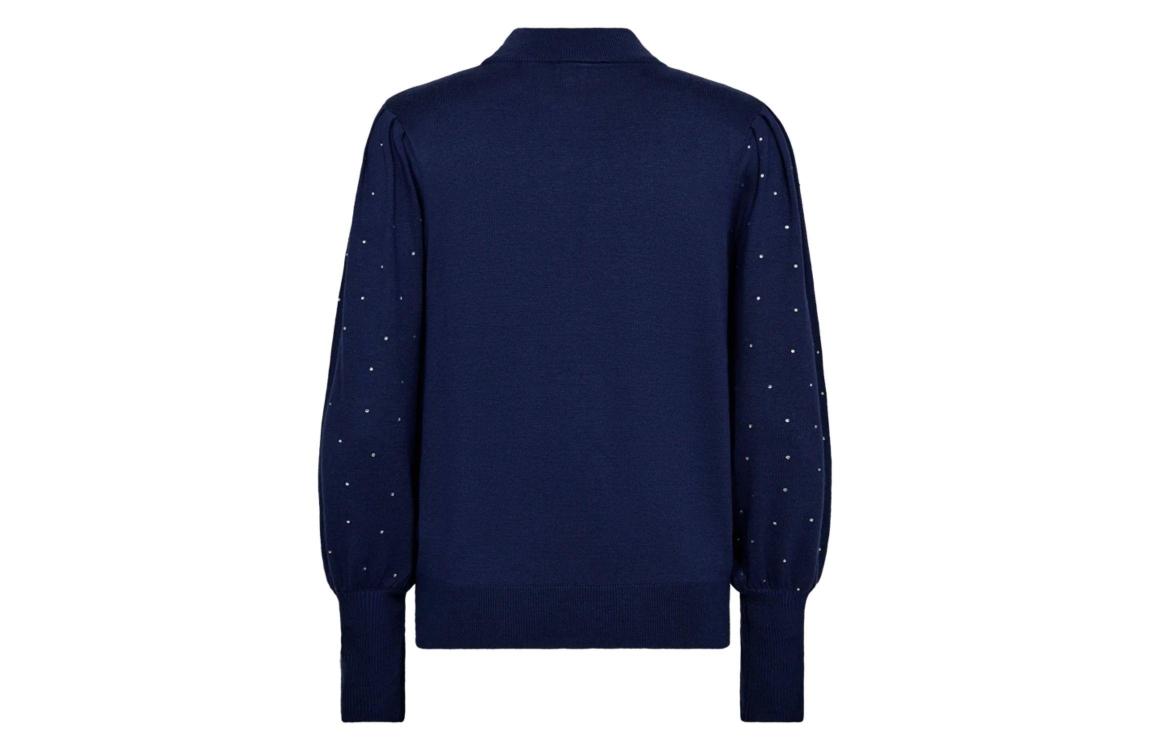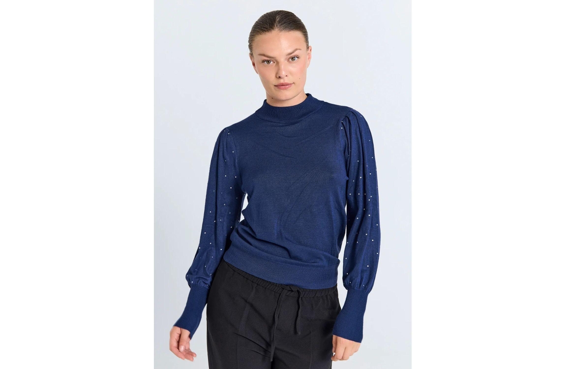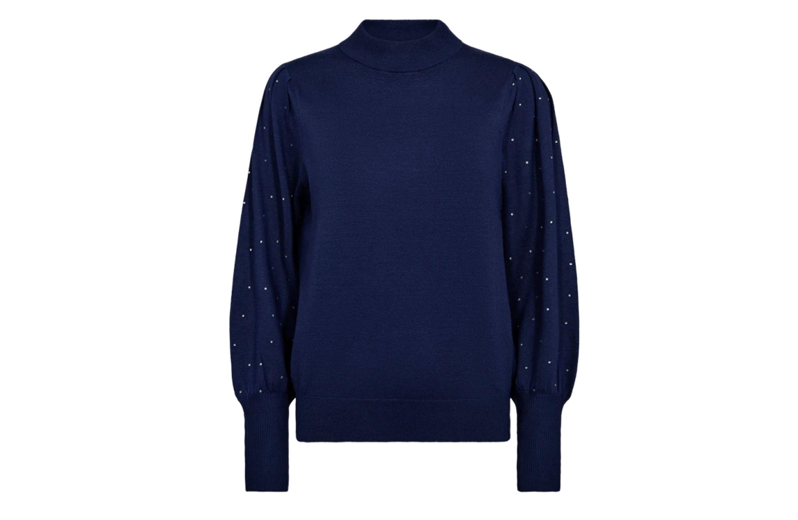Freequent High neck sleev w. rhinestone Patriot blue. Dit rechtvallende model is voorzien van een hoge hals en lange mouwen. Deze blauwe pullover van Freequent heeft pofmouwen met strass-steentjes en is afgewerkt met ribboorden.