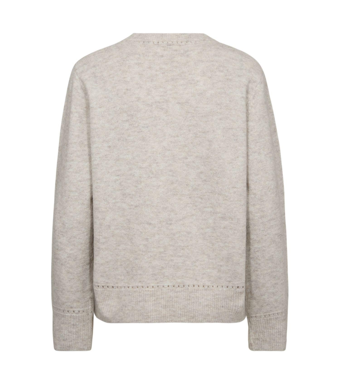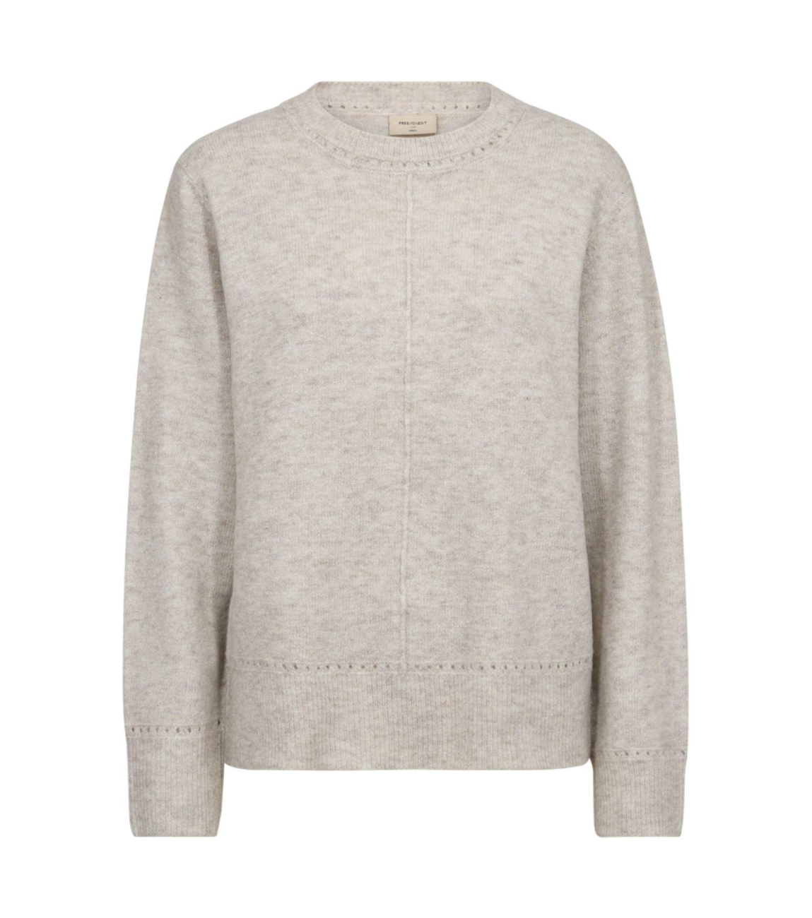 Freequent Hole details end metallic Moonbeam w.silver. Dit rechtvallende model is voorzien van een ronde hals en lange mouwen. Deze beige pullover van Freequent is gemaakt van een fijngebreide stof met een glanzende uitstraling en is op de mouwen bewerkt met ribdetails. Dit model is afgewerkt met brede ribboorden.